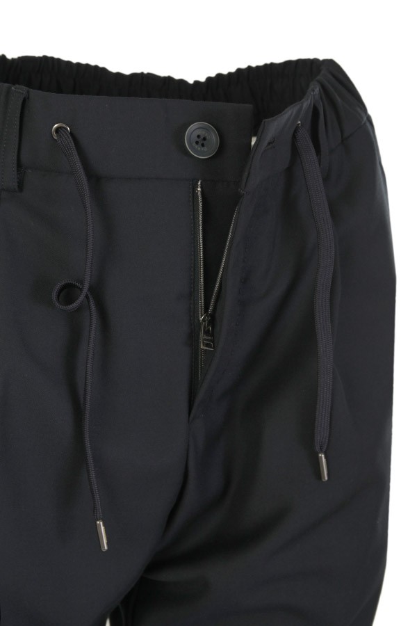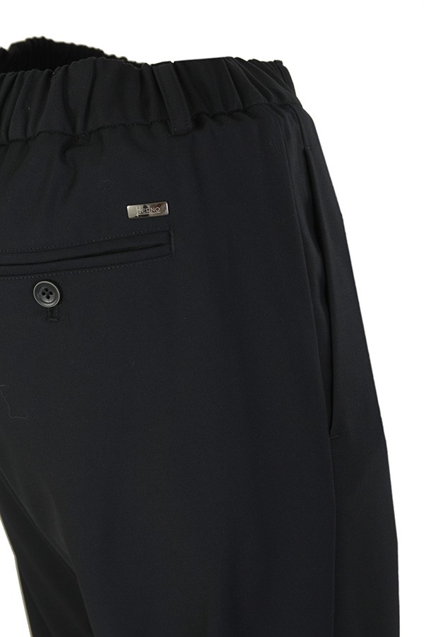 Made of technical fabric, with a regular fit. With elastic, drawstring and pleats. Concealed button and zip closure. Side pockets, buttoned welt pockets on the back.