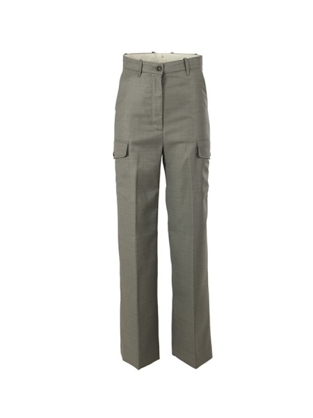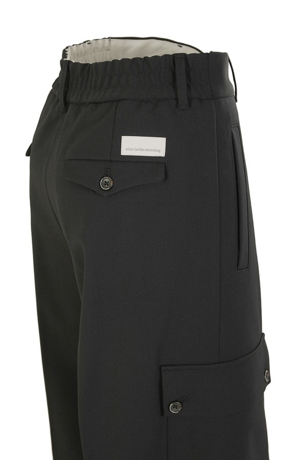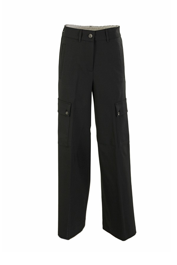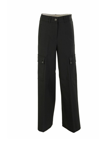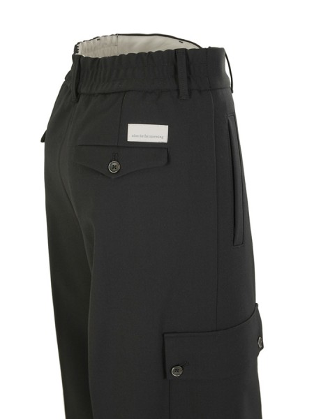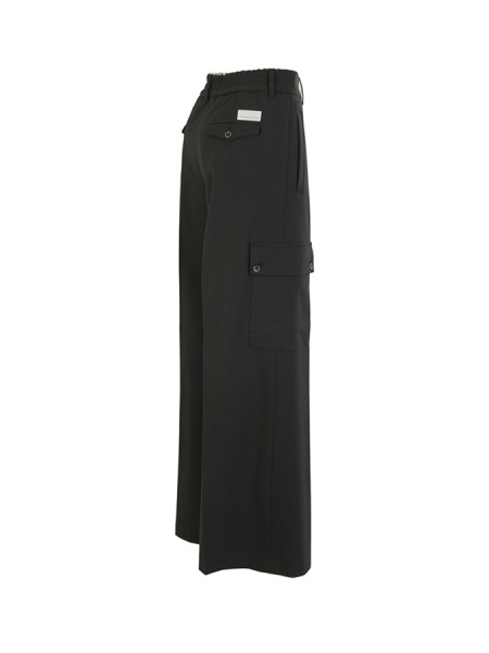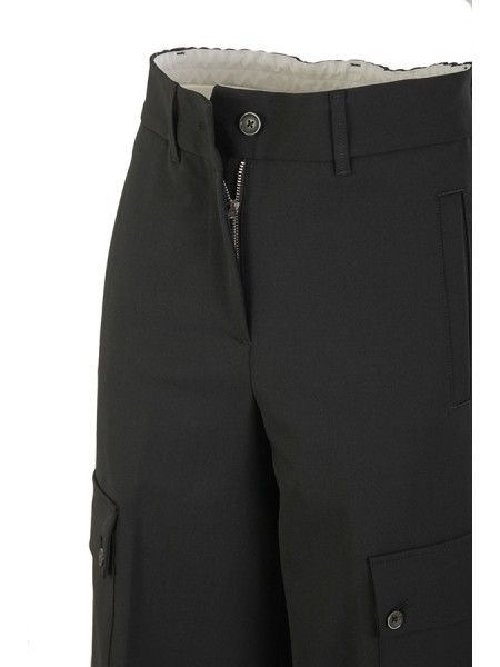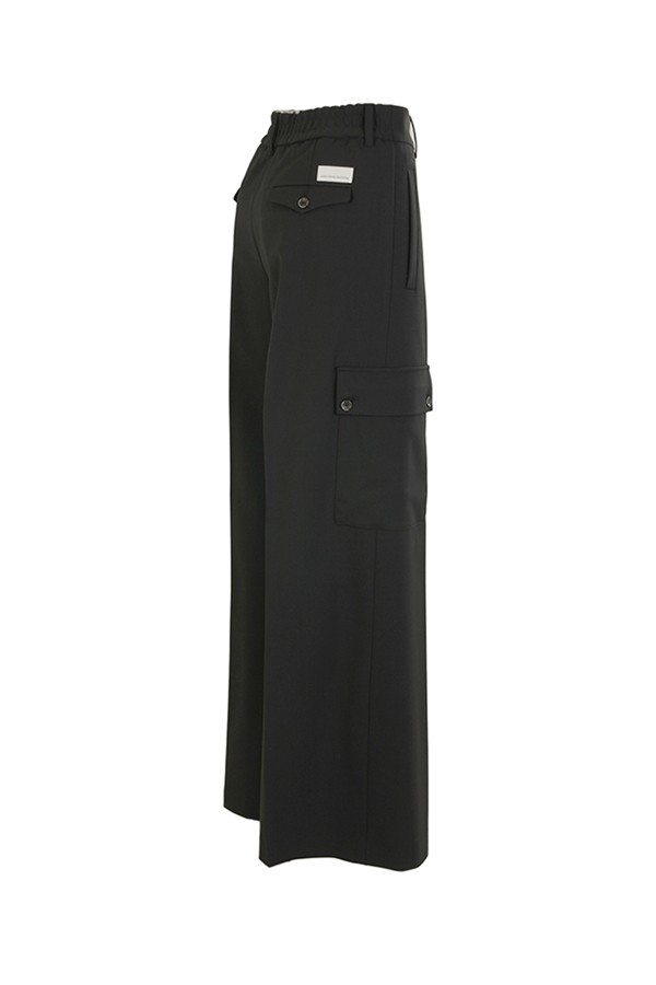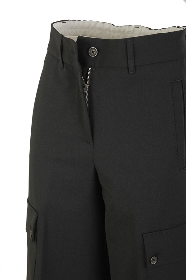 Made of wool blend, with belt loops. Half elastic. Wide leg and cargo pockets. Button and zip closure.