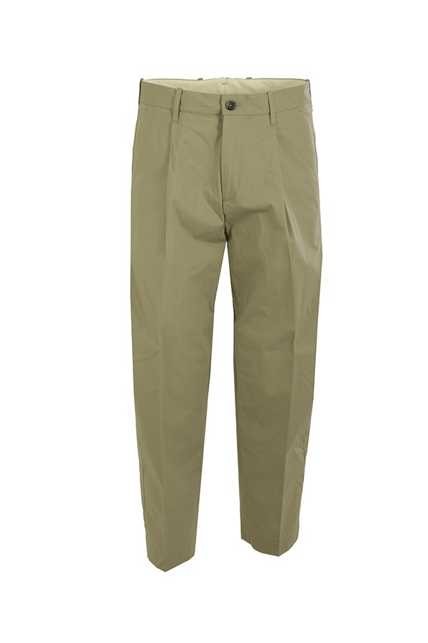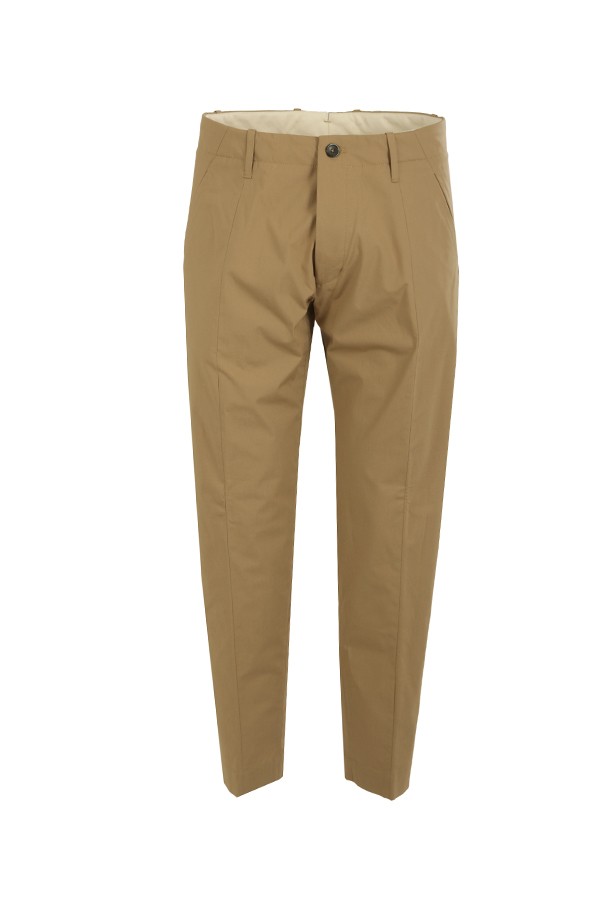 Chino model, in mixed color, front slant pockets. Back pockets with flap and buttons. Button closure.