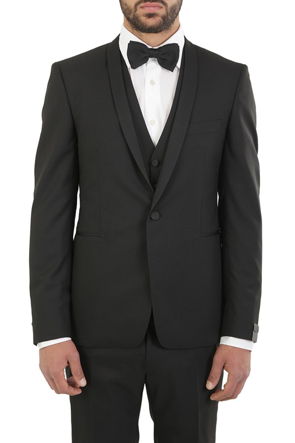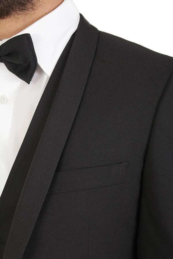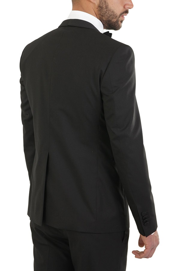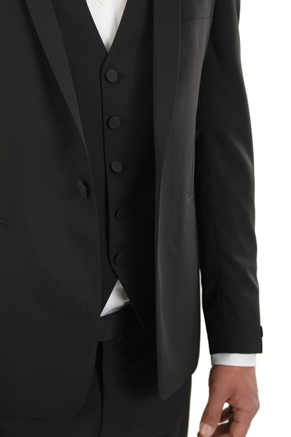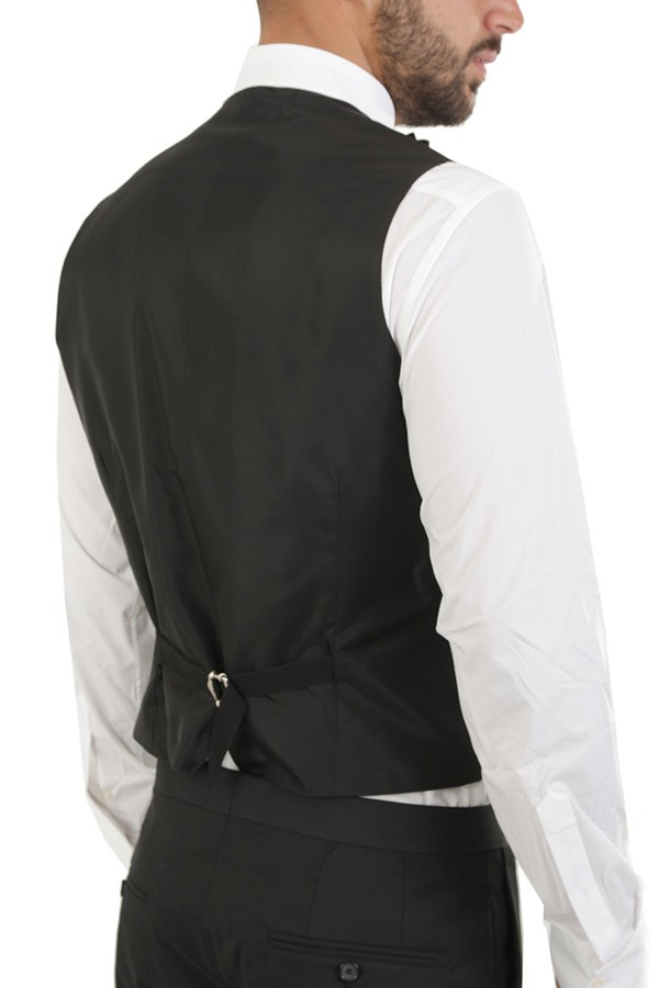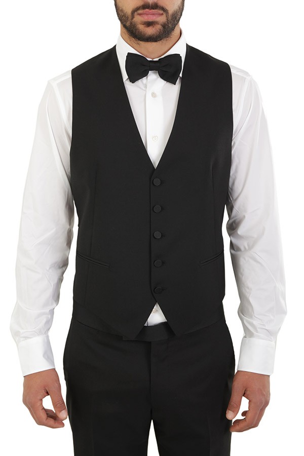 Tuxedo TAGLIATORE Art.EFBRMAURICEA01080001 N5023 made of black wool, trousers with welt pocket, fitted single-button jacket, waistcoat. Composition 100%wo. The model wears size 48.
