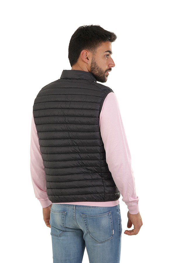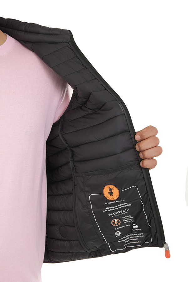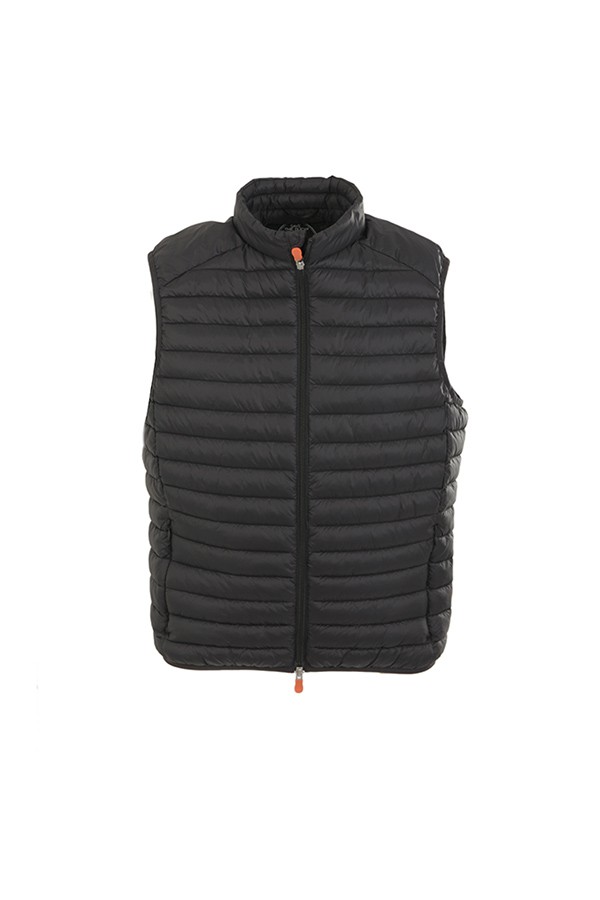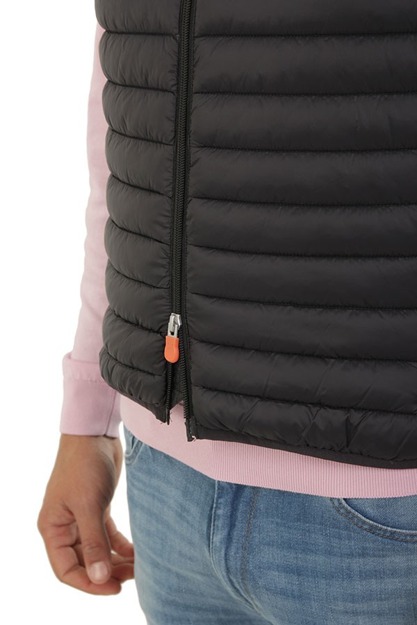 Save The Duck vest Art.D82410M GIGA16 10000 Adamus color black, combines the light quilted design with the mandarin collar, finished in Lycra on the bottom and armholes, the model features two-way closure and side pockets closed by zip, personalized orange zip puller and animal-free padding in Plumtech