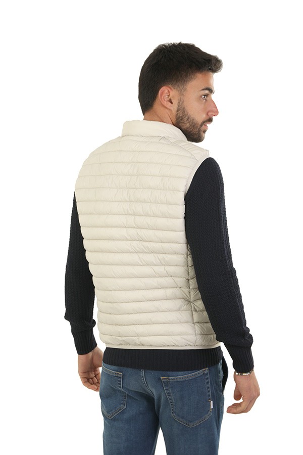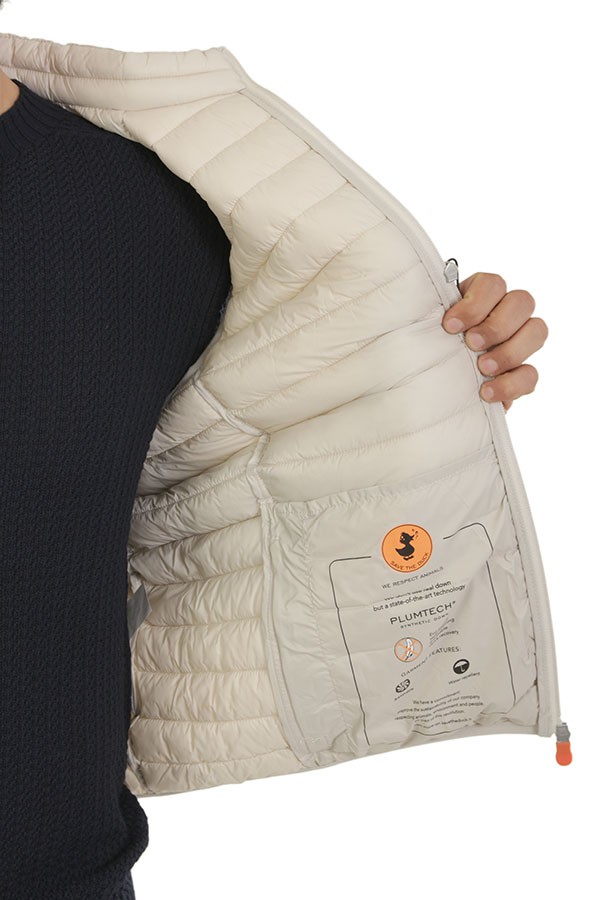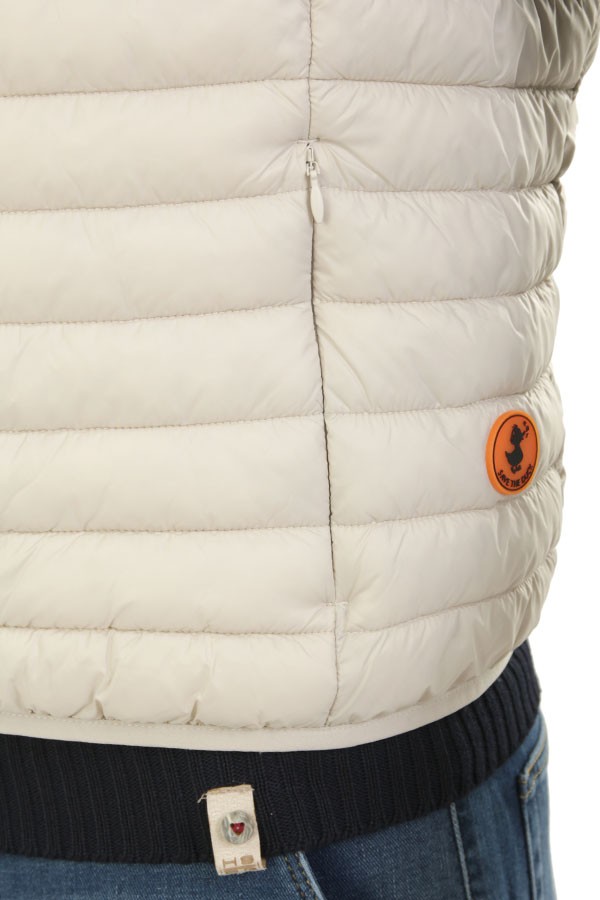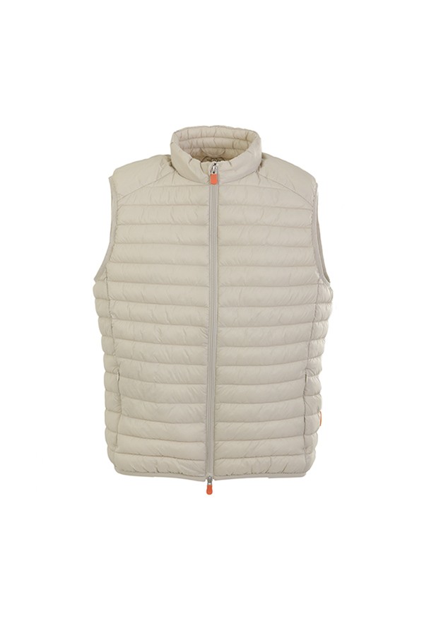 Vest SAVE THE DUCK Art.D82410M GIGA16 40019 Adamus beige color, combines the light quilted design with the mandarin collar, finished in Lycra on the bottom and armholes, the model features two-way closure and side pockets closed by zip, personalized orange zip puller and animal-free padding in Plumtech