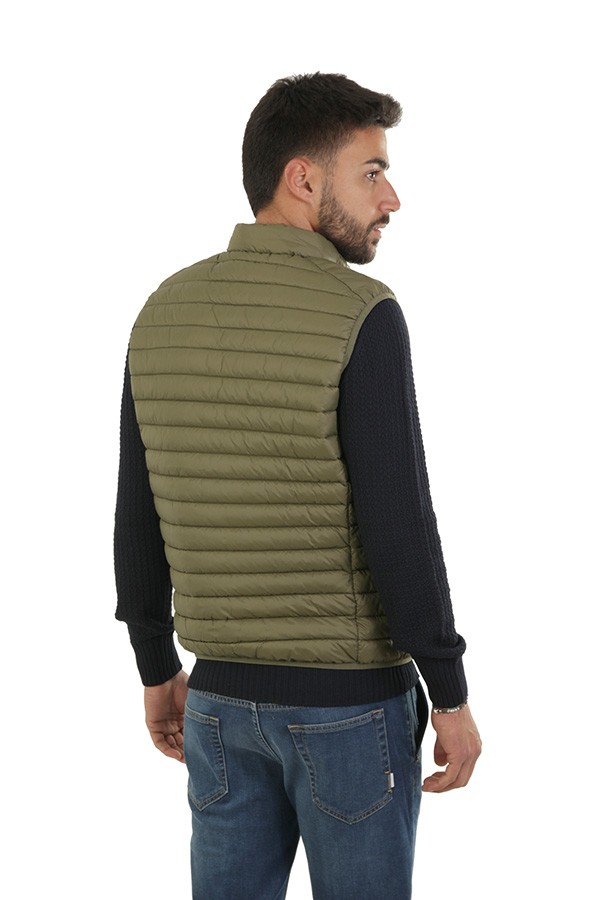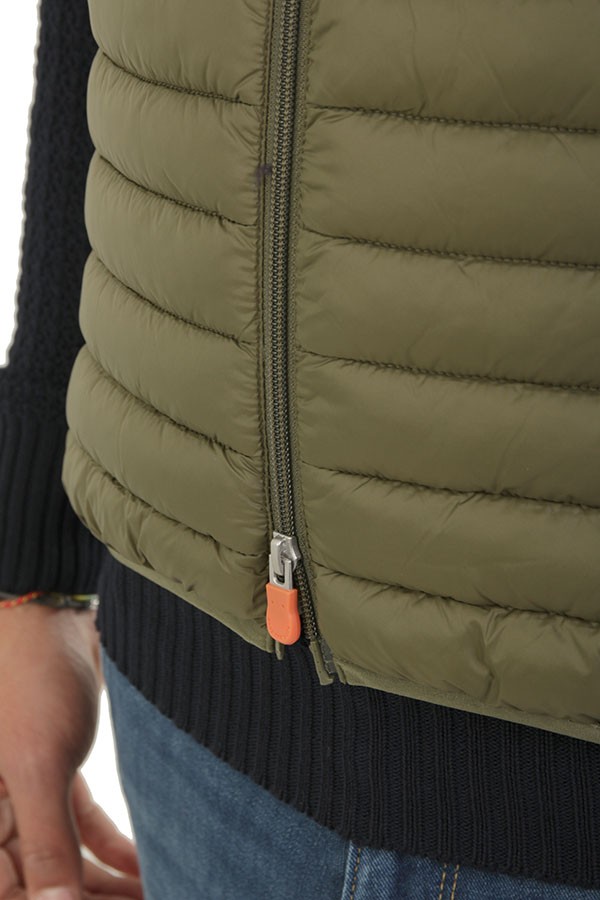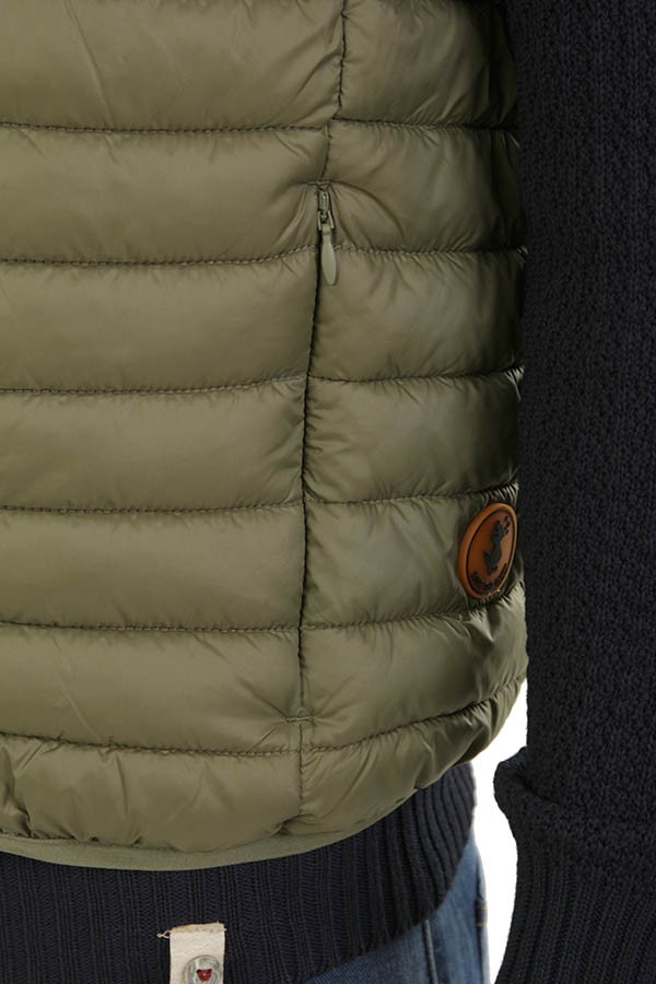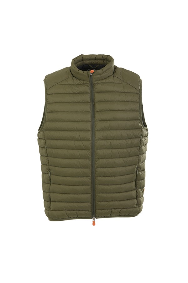 Vest SAVE THE DUCK Art.D82410M GIGA16 50012 Adamus olive green color, combines the light quilted design with the mandarin collar, finished in Lycra on the bottom and armholes, the model features two-way closure and side pockets closed by zip, personalized orange zip puller and animal-free padding in Plumtech