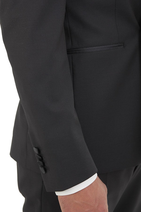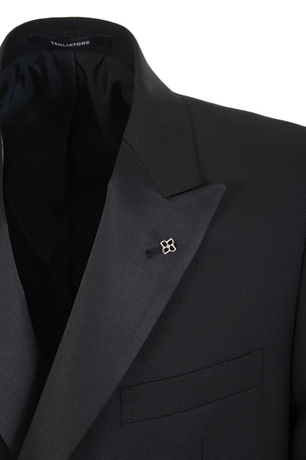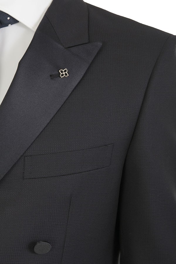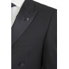 Smoking Tagliatore Art.SFBRDIONA01LIS550017 B5080 realizzato in lana colore blu, modello doppiopetto con rever, tessuto operato, gilet sfiancato, pantalone dalla vestibilità asciutta. Composizione 100%wo. Il modello indossa taglia 48.