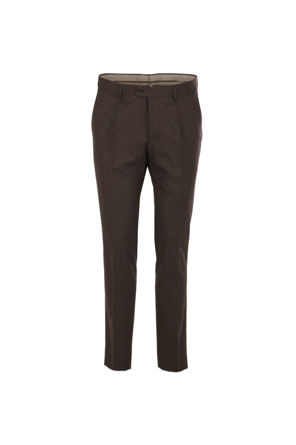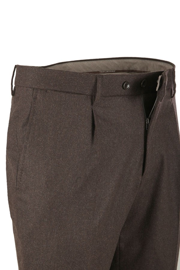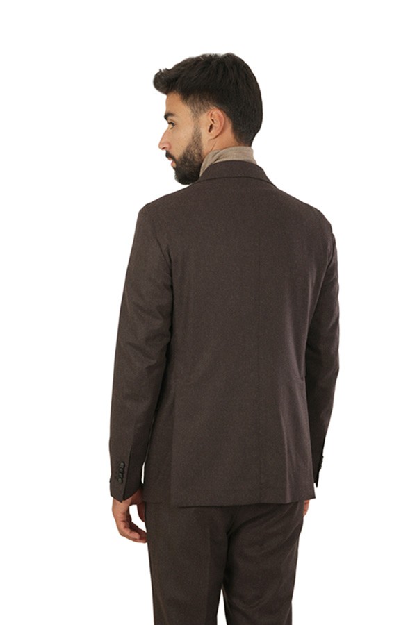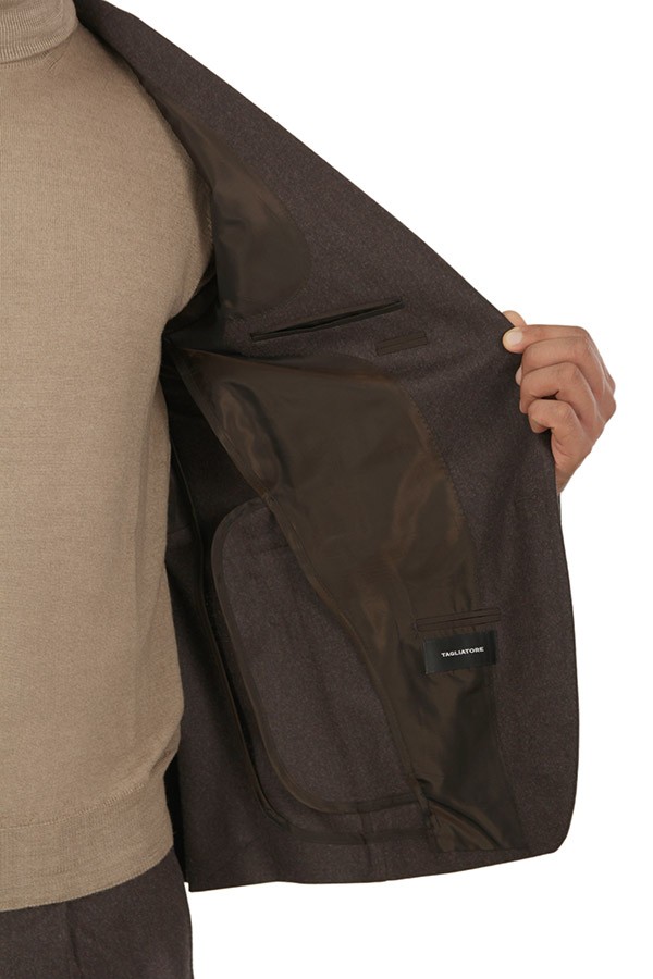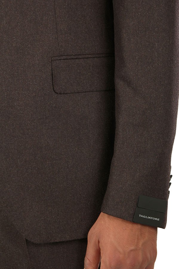Abito Tagliatore, color testa di moro, monopetto con monogramma in metallo. Un taschino sul petto e due tasche con patta. Pantalone con chiusura con bottone e zip. 90%lana 5%cashmere, 3%poliammide 2%elastan. Made in Italy.