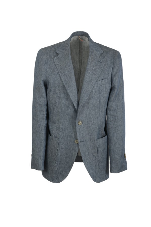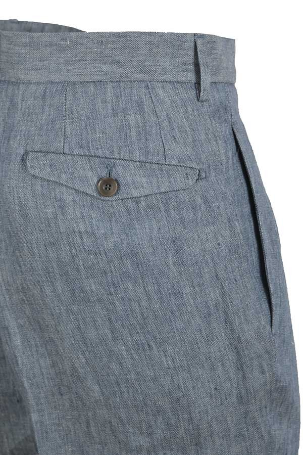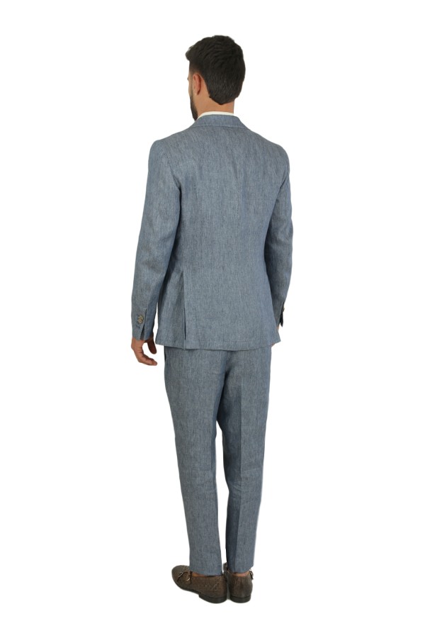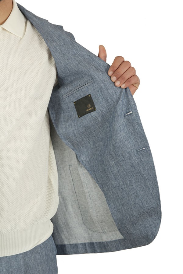 Realizzato in lino. Giacca monopetto, con tasche toppa. Pantalone con pences,e tasche posteriori con patta e bottone.
