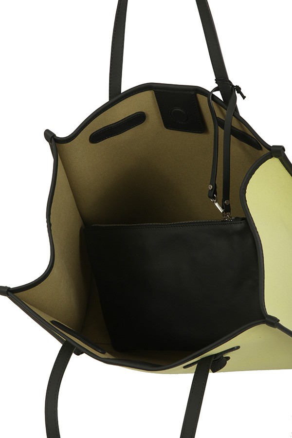 Realizzata in canvas, con manici e profilo in pelle. Chiusura con magnete. Pochette interna, staccabile, realizzata interamente in pelle.