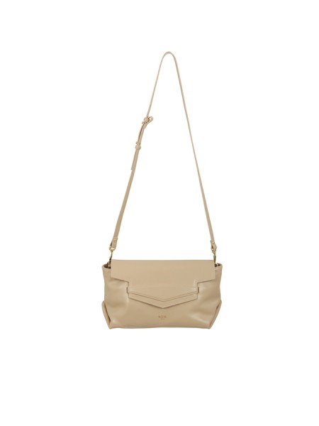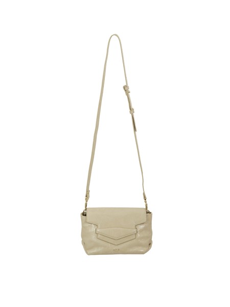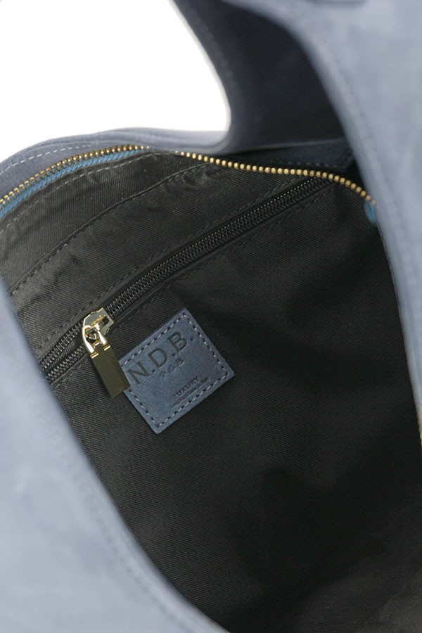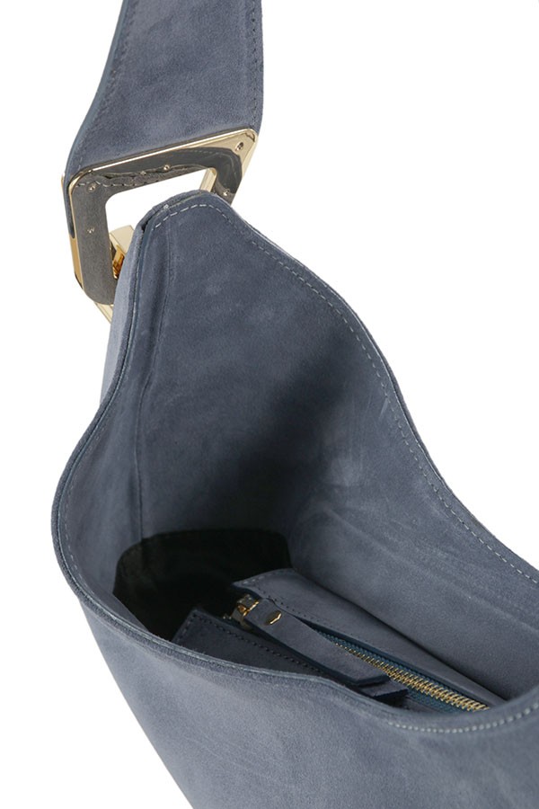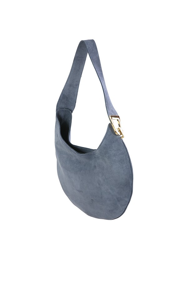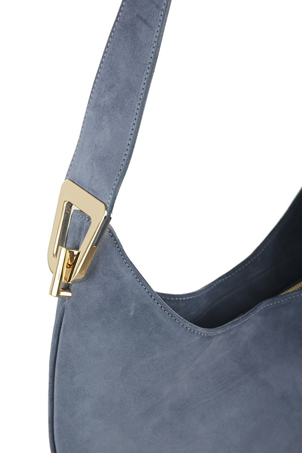 Realizzata in suede, dalla forma a mezza luna, da portare a spalla. Con dettaglio oro. Chiusura con zip, taschino interno.