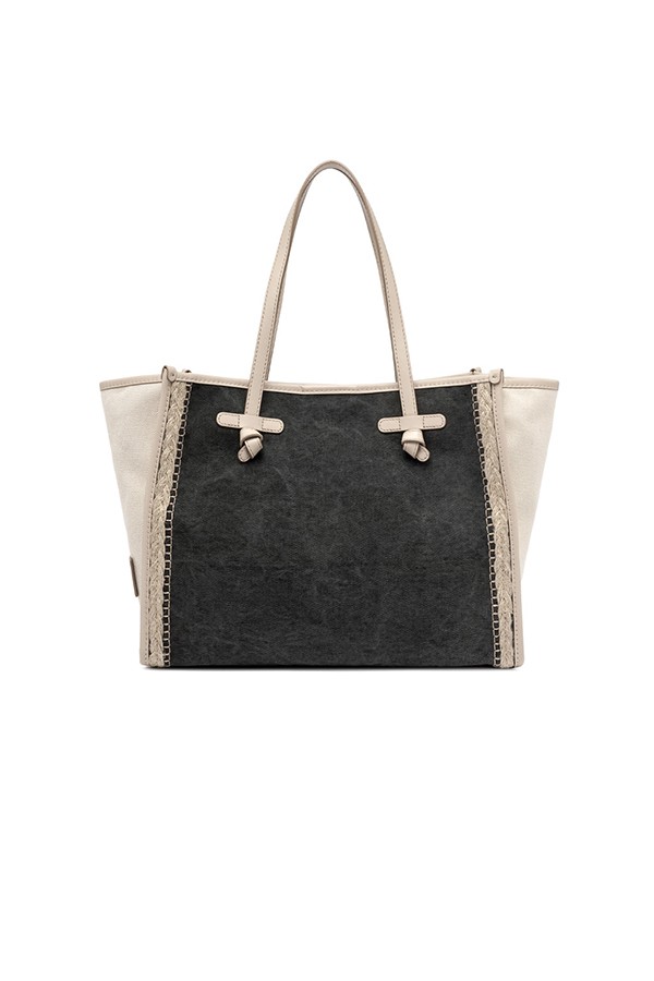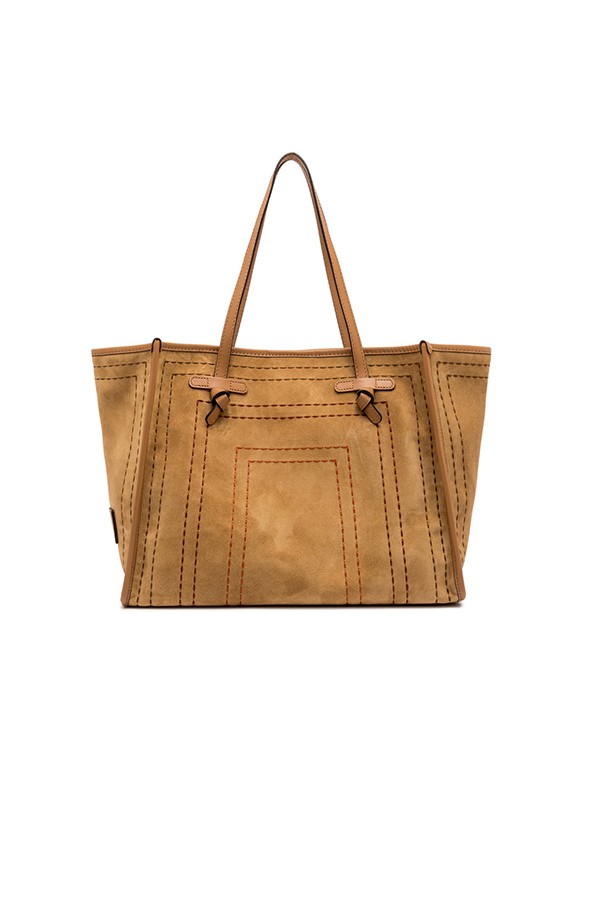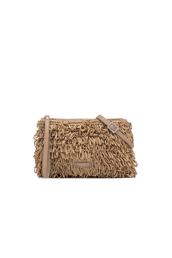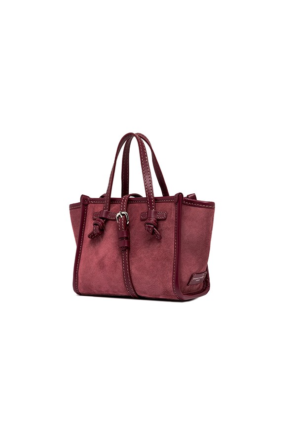 Realizzata in pelle scamosciata, con profili e tracolla in pelle. Chiusura con zip.