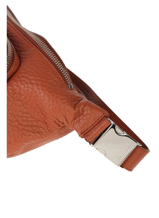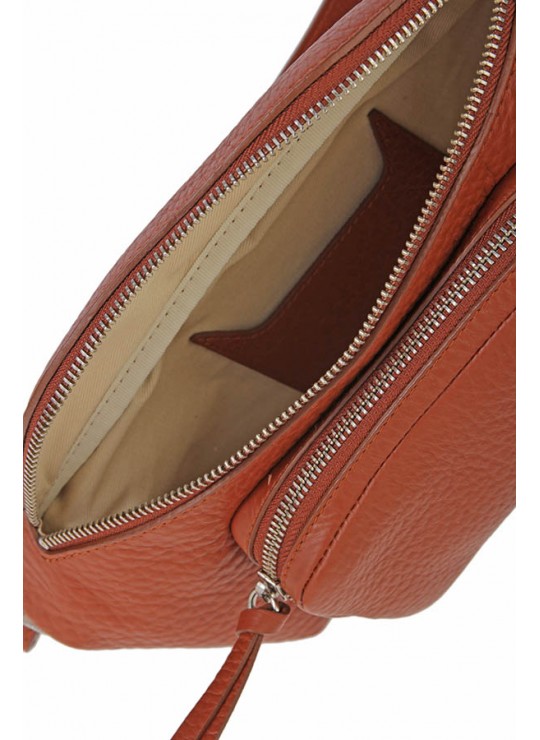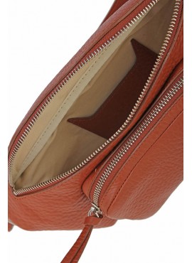 Marsupio soft a spalla in pelle colore tabacco, chiusura con zip, tasca anteriore con zip, cinturino regolabile.