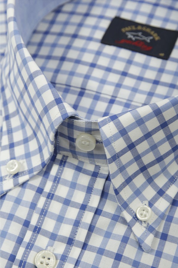 Camicia in cotone fantasia quadri colore celeste e blu, modello button down, mezza manica, vestibilità regolare.