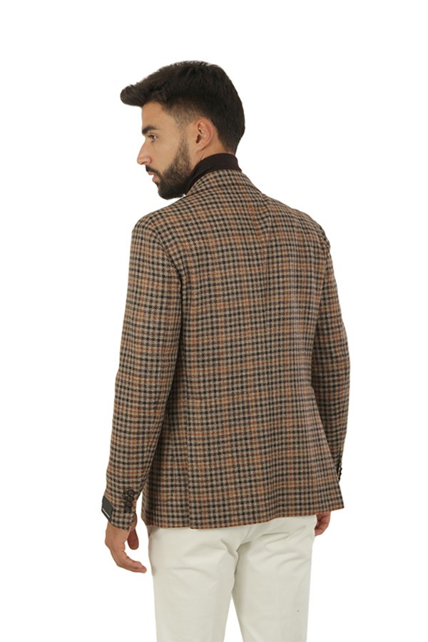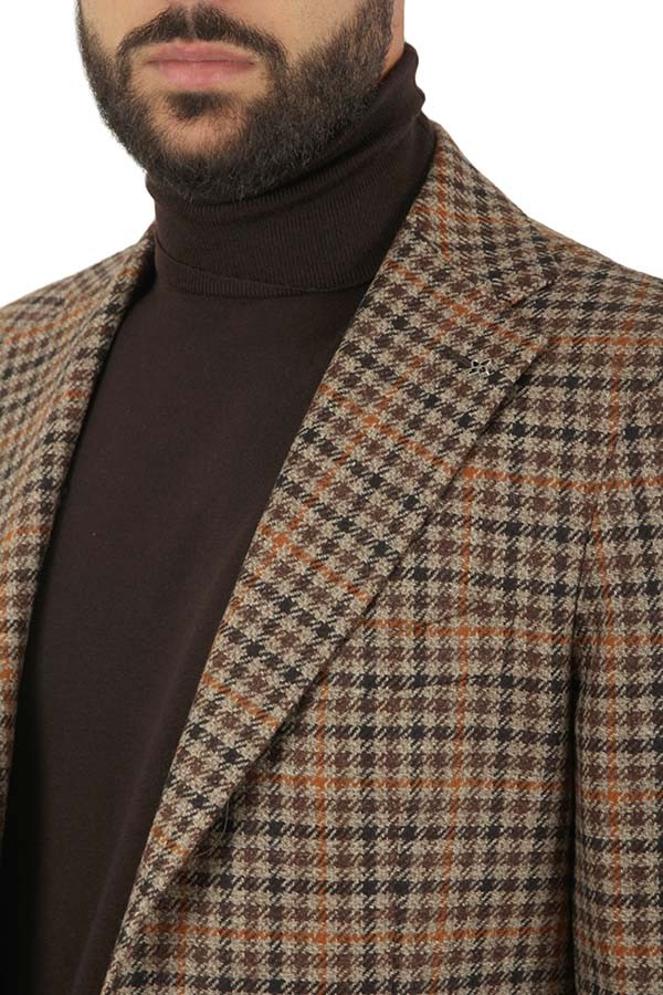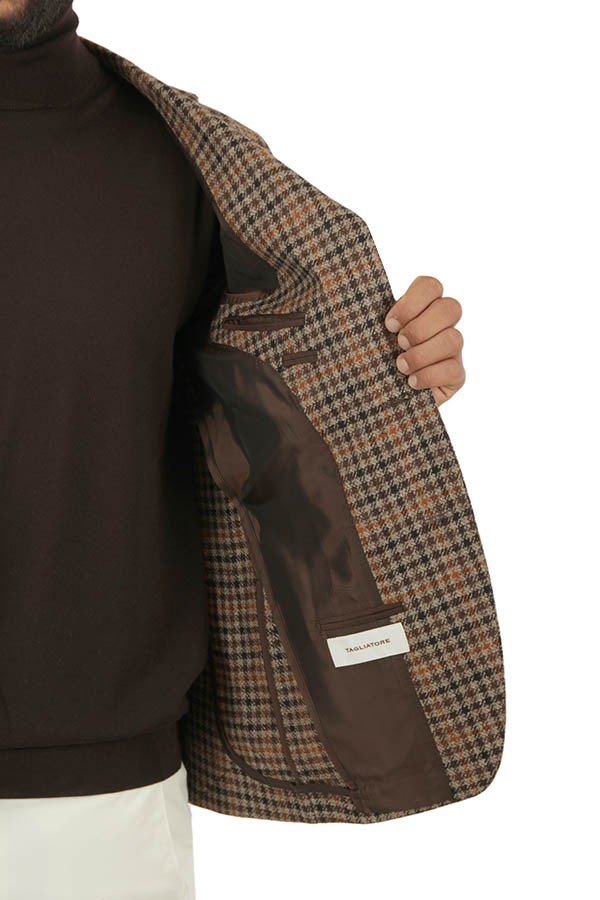 Giacca Tagliatore in Misto Lana Vergine, Color testa di moro,a quadretti con revers classico, chiusura frontale con bottoni. Un taschino sul petto e due tasche frontali, bottoni ai polsi e tasca interna con bottone parzialmente foderato Made in Italy.95%lana 5%cashmere