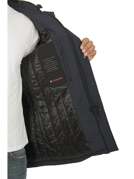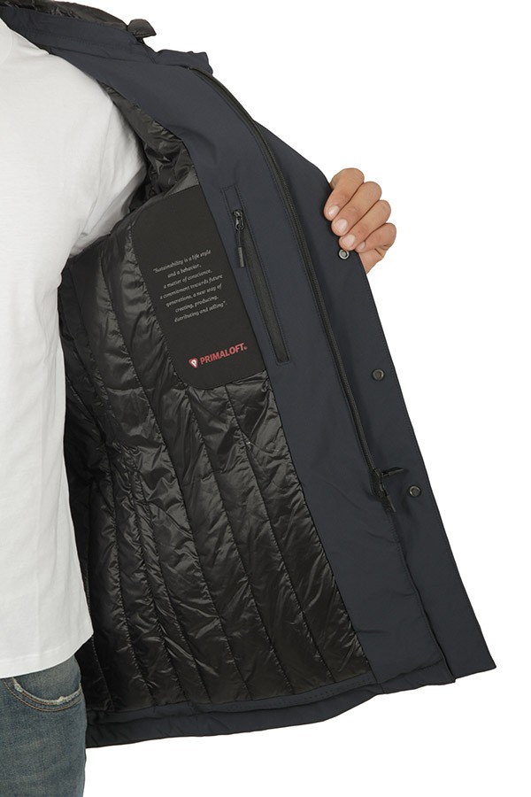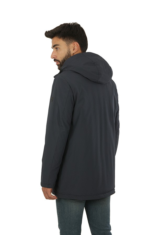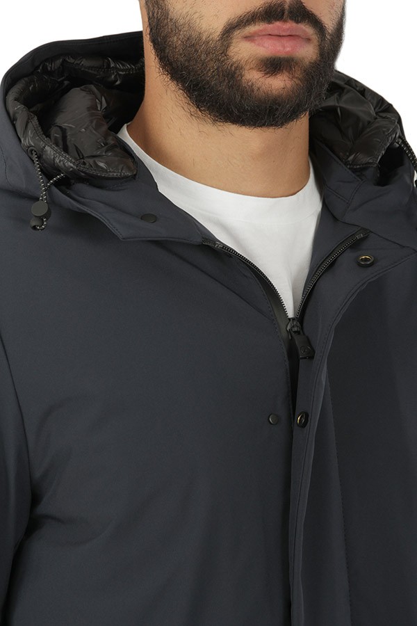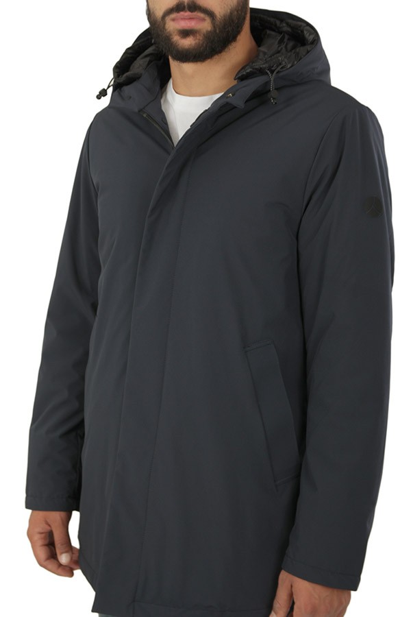 Parka Blu Navy, in tessuto tecnico con interno trapuntato. Zip doppio cursore. Primo bottone a pressione gommato  e chiusura centrale con bottoni a pressione nascosti. Doppio cappuccio trapuntato staccabile con isolante termico. Tasca interna porta documenti e tasca interna porta cellulare nastrate.