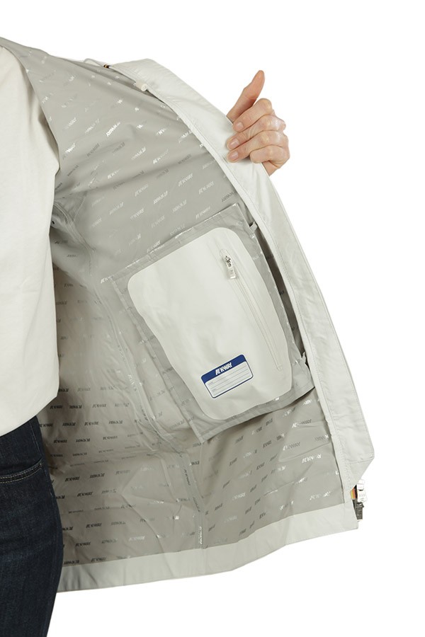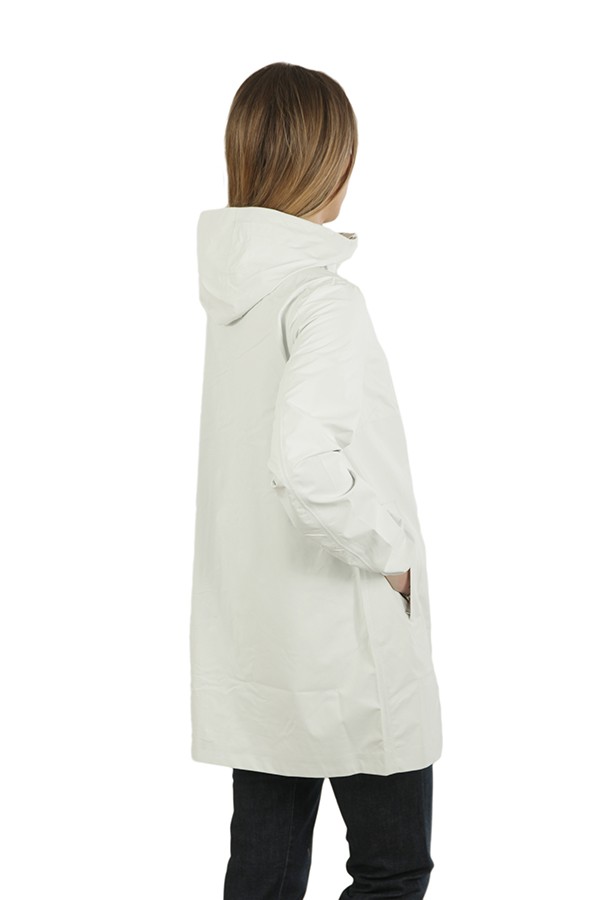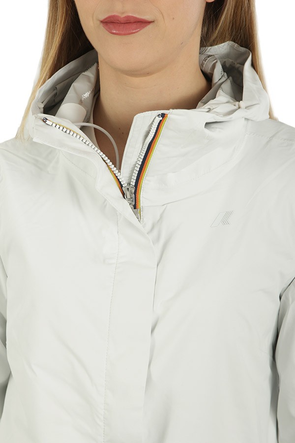 Modello Sophie Stretch Dot, lunghezza tre quarti, vestibilità slim. Realizzato in poliestere riciclato, impermeabile e traspirante, con cappuccio regolabile. Interno logato con tasca. Cuciture termonastrate. Chiusura con zip e pattina, polsi con elastico, due tasche con zip, logo stampato.