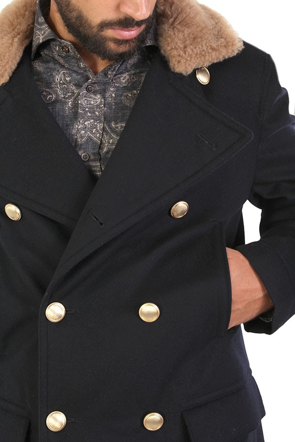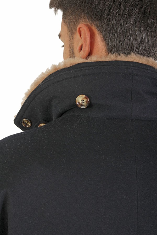 Abbottonatura un petto e mezzo. Bottoni in metallo. Collo con inserto in shearling, removibile.