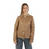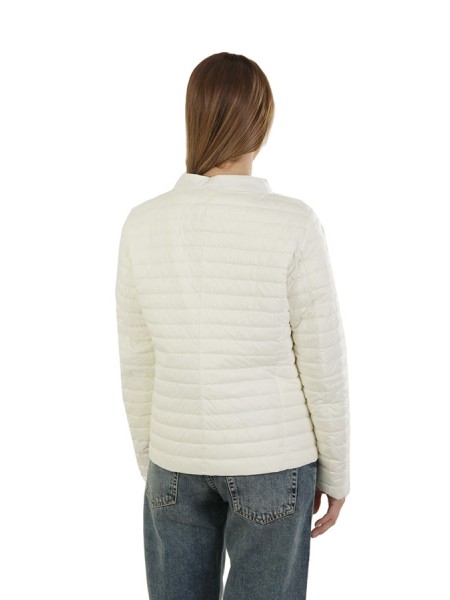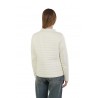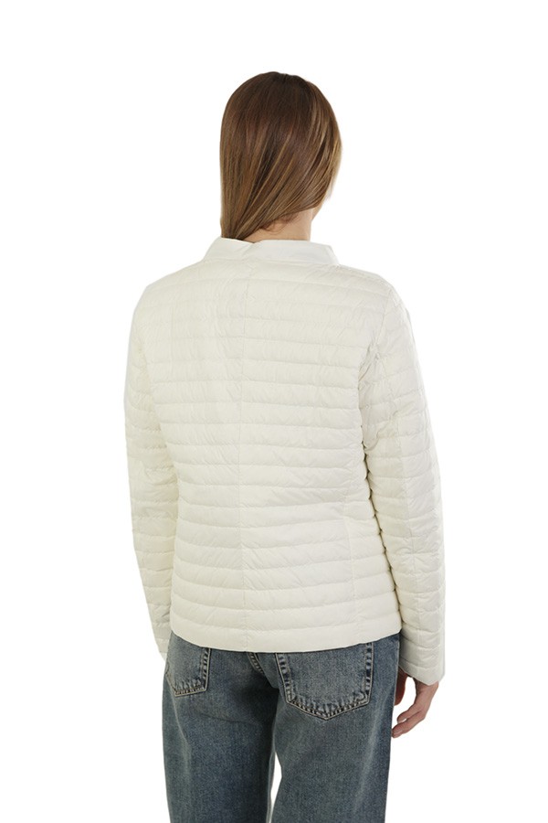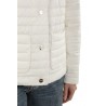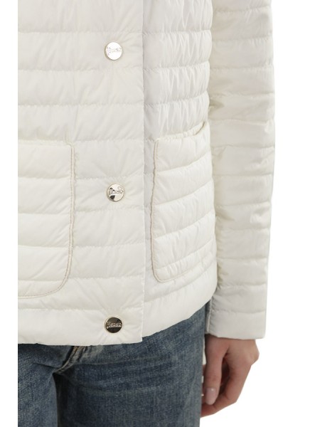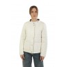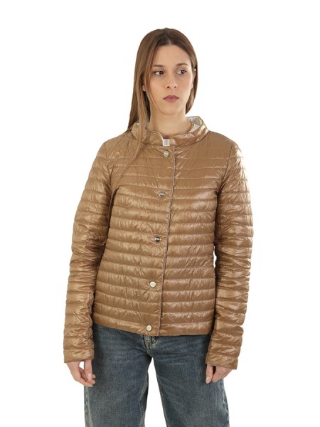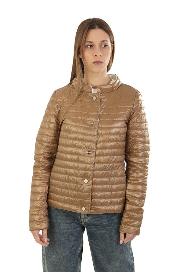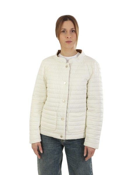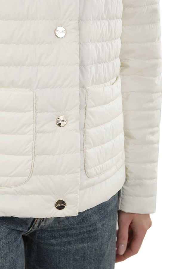 Piumino Herno Art.PI0631D 19288 1021 realizzato in tessuto down-proof colore beige e bianco con membrana interna, reversibile in poliuretano e Nylon Ultralight. Il mix di questi due stili coniuga l’effetto serico del nylon al finish opaco del morbido tessuto Nuage. A completare il modello, tasche applicate su un lato e tasche a filetto su l'altro. La modella indossa taglia 42.