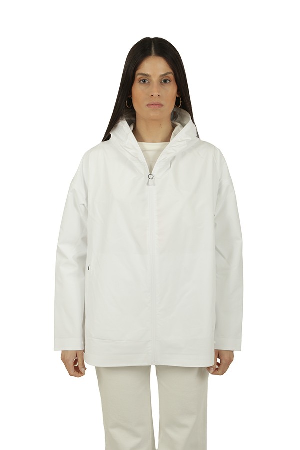 Rachel, medio. Con collo alto e cappuccio staccabile. Tasche con zip, chiusura con zip.