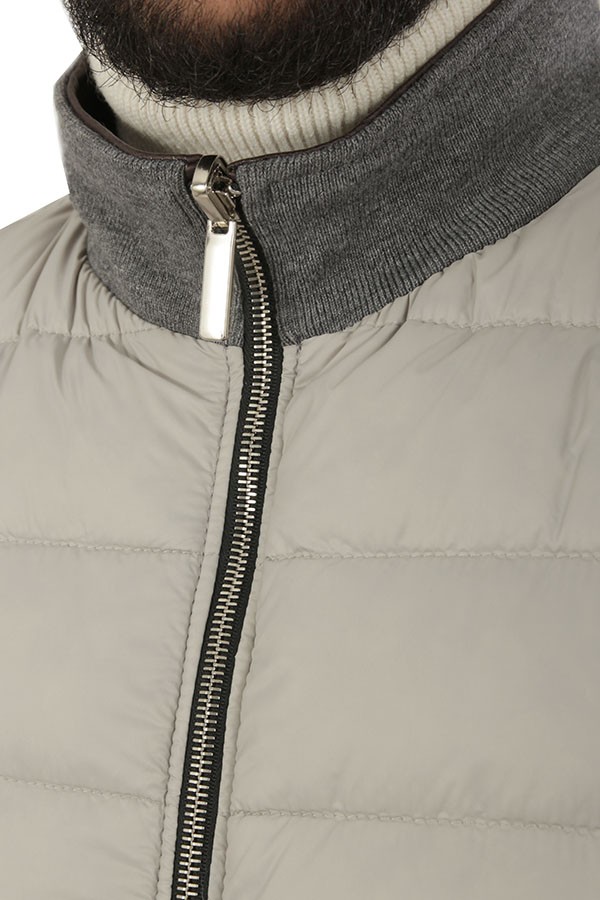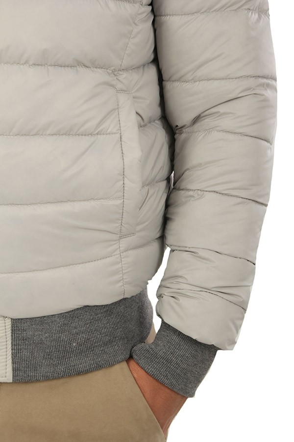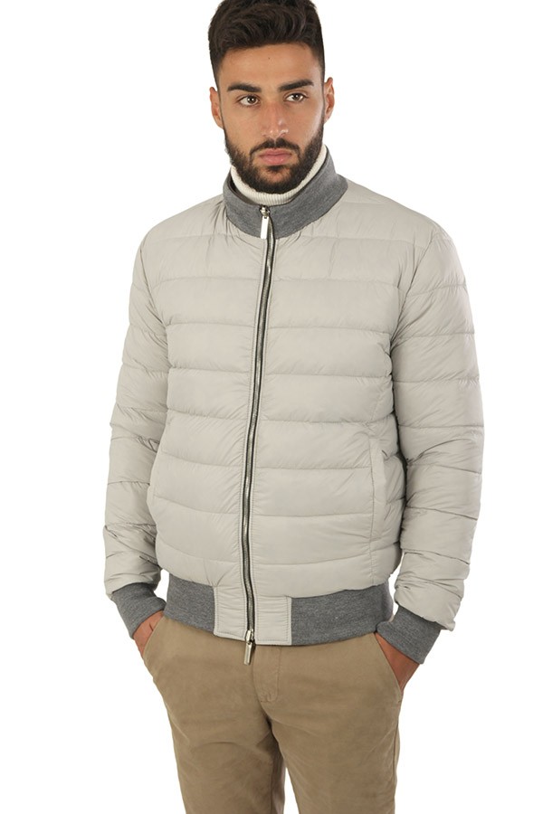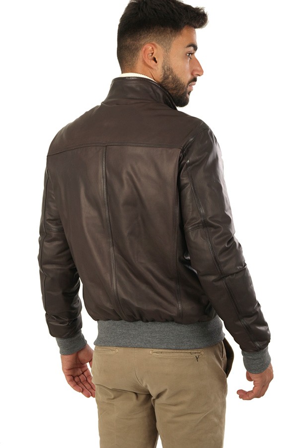 Giubbotto Volfagli SPIDER8 ARDESIA/GRIGIO tuscany realizzato in nappa vegetale colore ardesia, modello reversibile con parte interna in piumino trapuntato colore grigio, chiusura con zip, tasche a filo. Il modello indossa taglia 48.