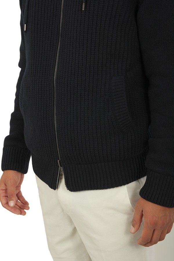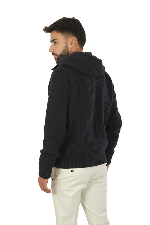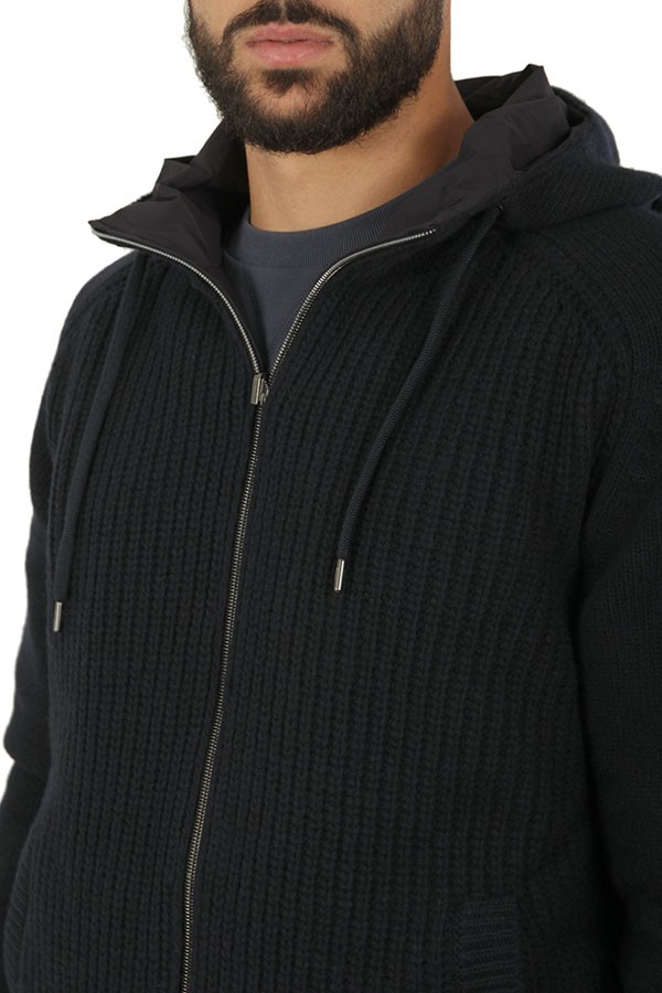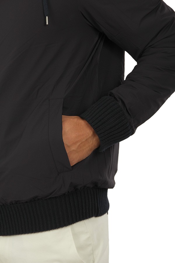 Bomber Resort In Infinity Mix Knit E Rev Ponente Art.MC00020UR70145 92000.Bomber blu,in maglia di lana con cappuccio,reversibile con tessuto di nylon. Tasche a filetto,lavorazione pannocchia finezza 5.