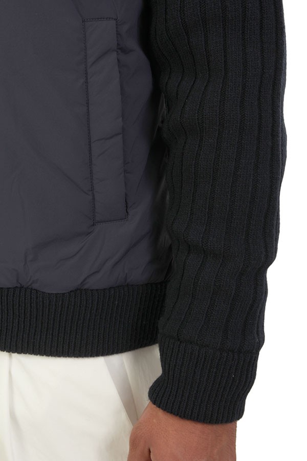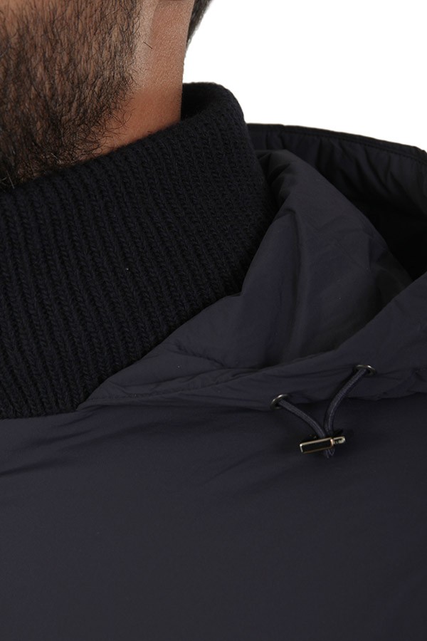 Linea Resort, nylon e lana. Opaco e ultralight, con cappuccio. Collo e maniche in lana.