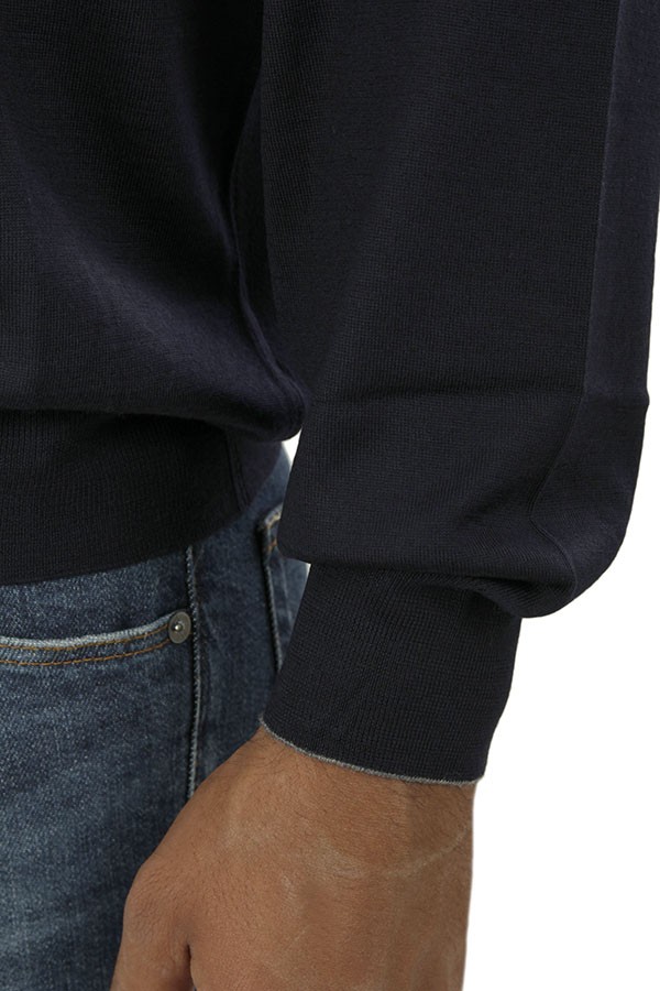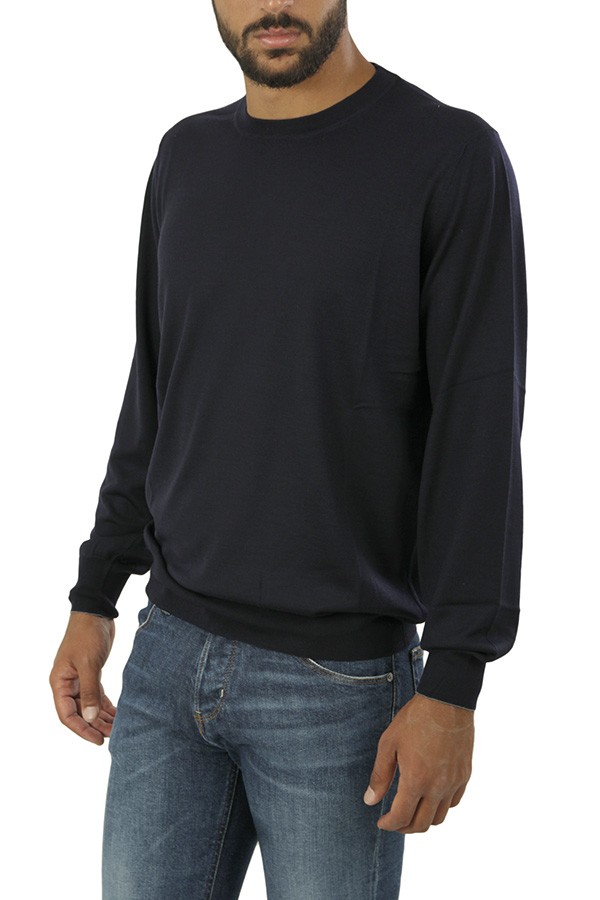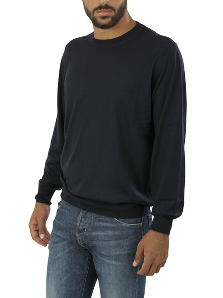Maglia girocollo Art.M2400100 CW425 in lana e cachemire colore blu, i filati vengono lavorati per ottenere una texture omogenea e compatta e ne conferiscono un tocco casual, il fit è regolare con volumi che rimangono accostati al corpo. Composizione 90%wv 10%w. Il modello indossa taglia 48.
