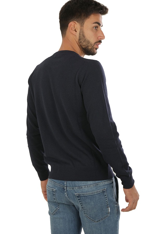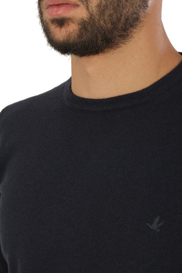 Maglia Brooksfield Art.K001 0176 realizzata in lana jersey colore blu modello girocollo, logo ricamato sul petto a contrasto. Composizione 100%wv. Il modello indossa taglia L.