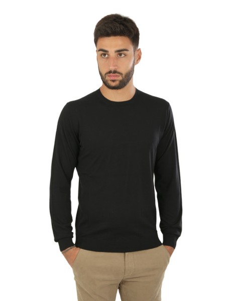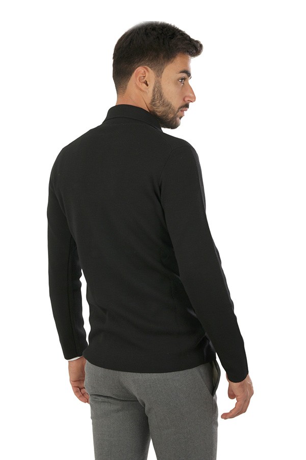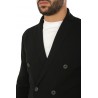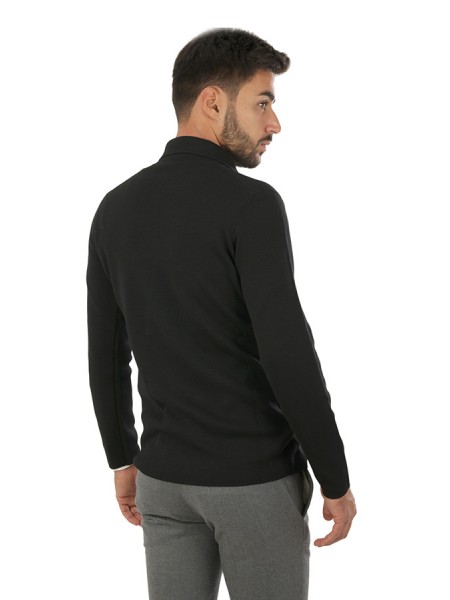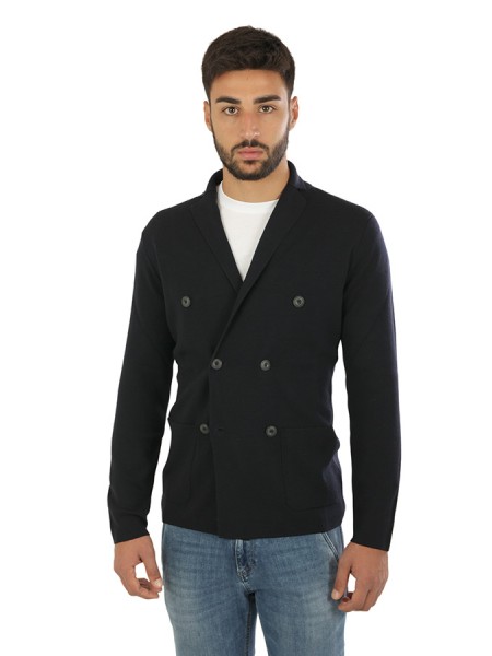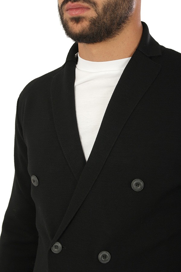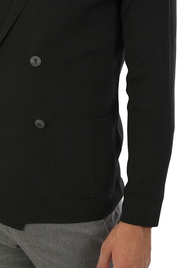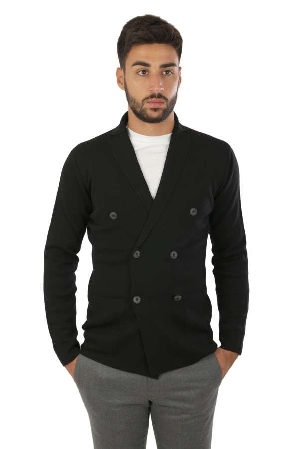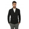 Maglia Hindustrie Art.RJMLDPT WM14M 990 modello cardigan doppio petto realizzato in lana colore nero, tasche a toppa, slim fit. Composizione 100%wv. Il modello indossa taglia 48.