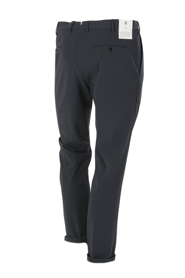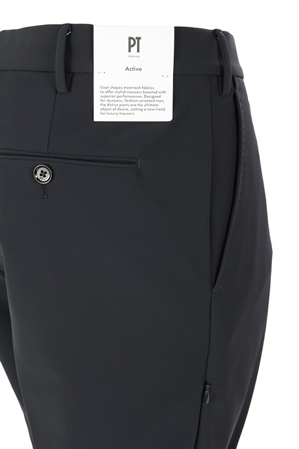 Pantalone Art.VSALZ00KLT CV12 0360 realizzato in tessuto tecnico colore blu, tasca a filo, tasche posteriori a filetto con bottone, chiusura con bottone e zip. Vestibilità slim. Composizione 78%pa 12%ea 10%pu. Il modello indossa taglia 48.