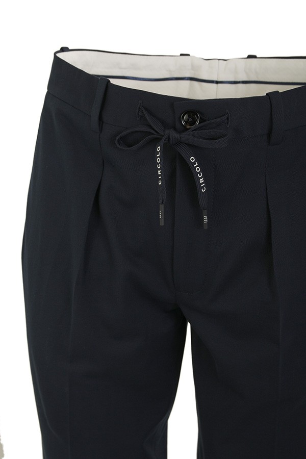 Pantalone Circolo Art.CN3820 447 realizzato in misto cotone piquet colore blu navy, modello con pences, tasche a filo e coulisse in vita. Composizione 97%co 3%elastam
