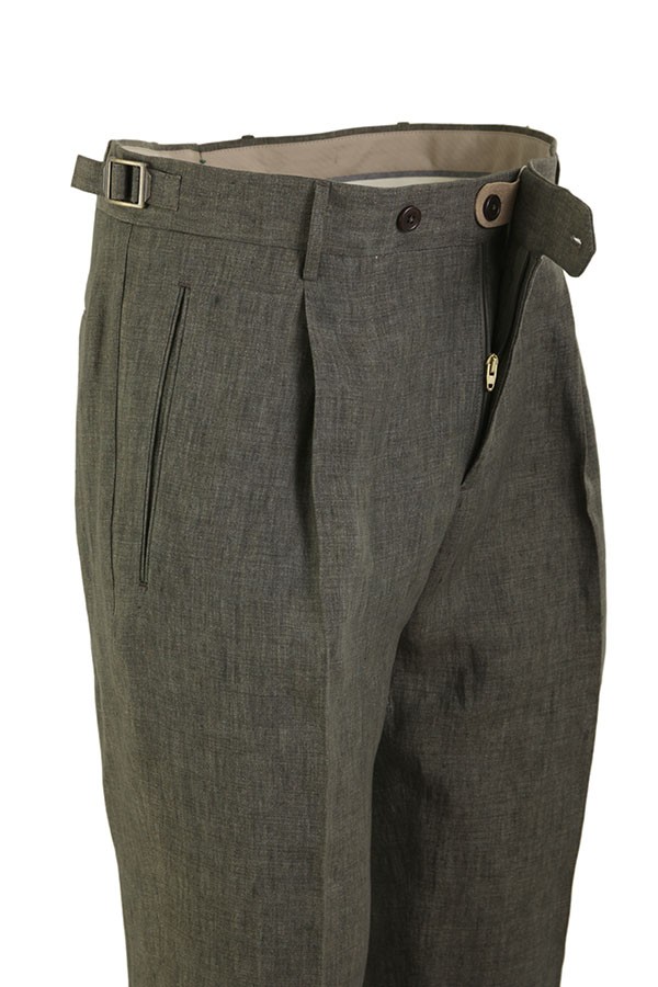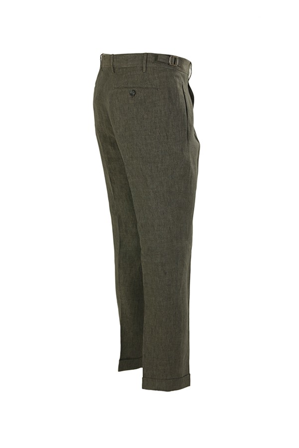 Pantalone Berwich Art.RETRO IM104 VERDE realizzato in lino colore verde, modello con fibbie laterali in via, tasca a filo, pences e piega sul fondo.