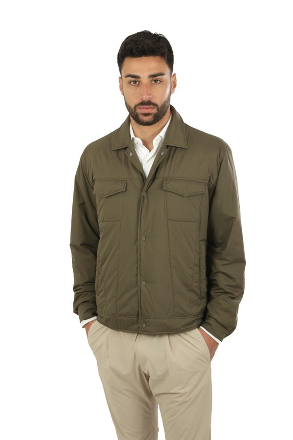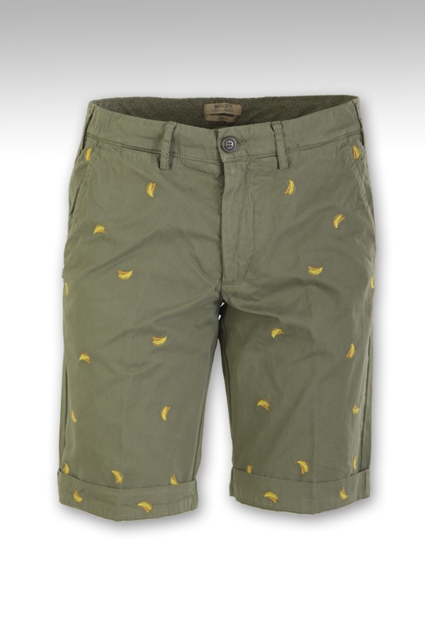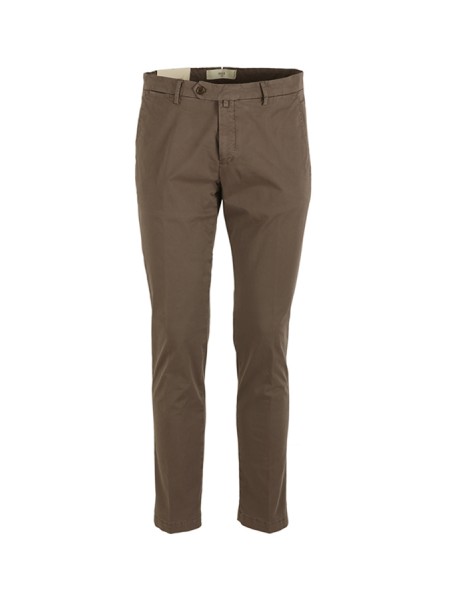 In gabardina. Con tasche america anteriori e a filetto posteriori. Chiusura con zip e bottoni.