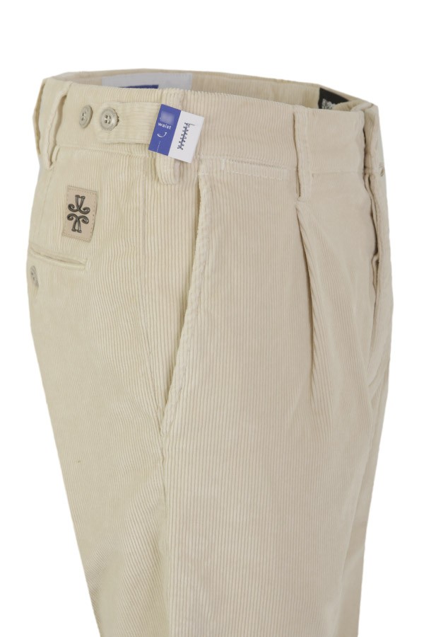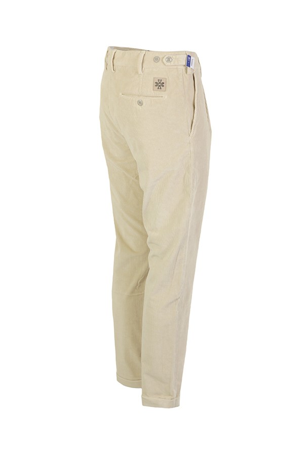 Modello Henry, in velluto a costine. Con pinces e tasche all'americana. Tasche posteriori a filetto con bottone. Chiusura con bottoni e piega sul fondo.