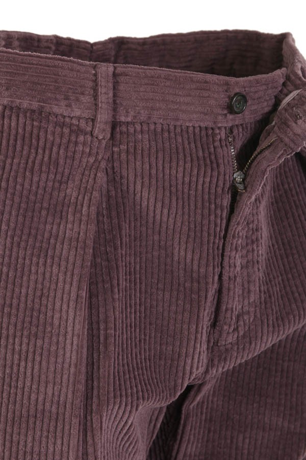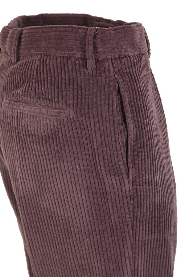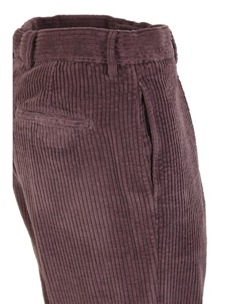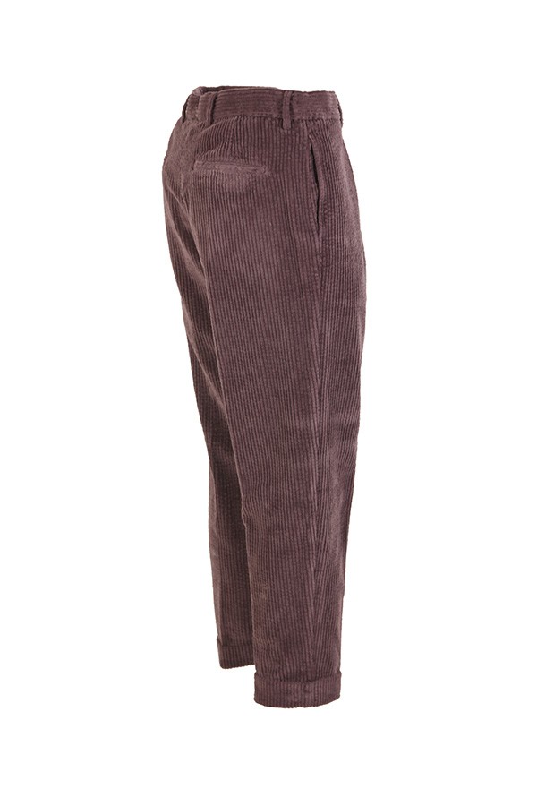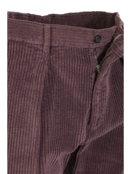 Realizzato in cotone, in velluto a coste. Chiusura con zip e bottone. Con pinces. Tasche a filo anteriori. Piega sul fondo. Tasche a filetto posteriori.