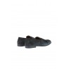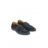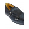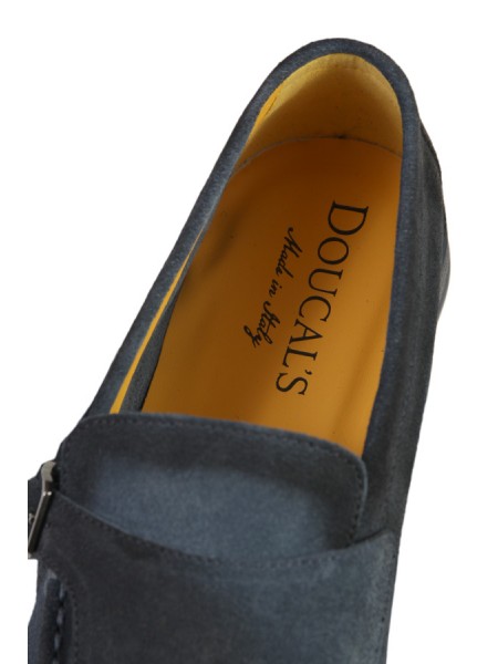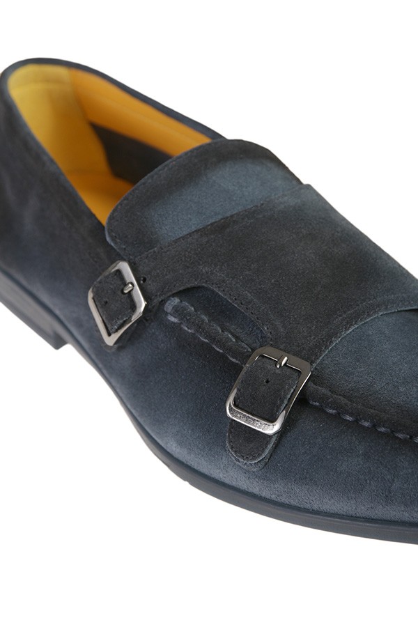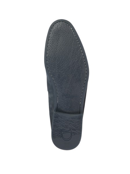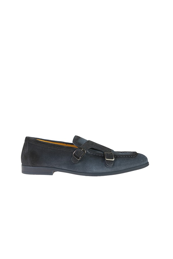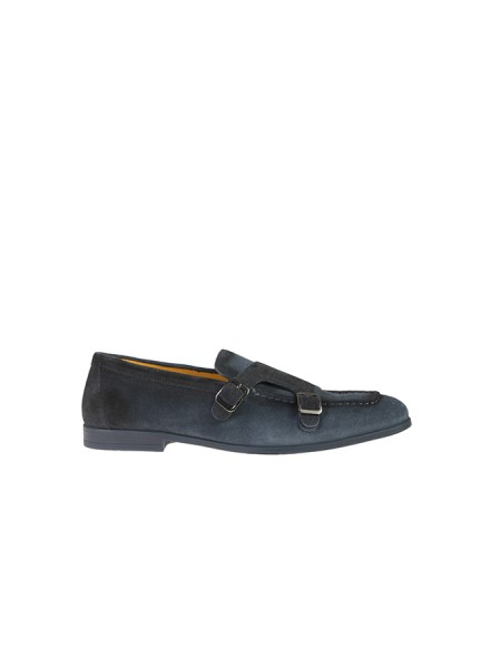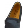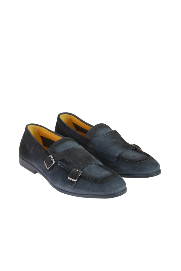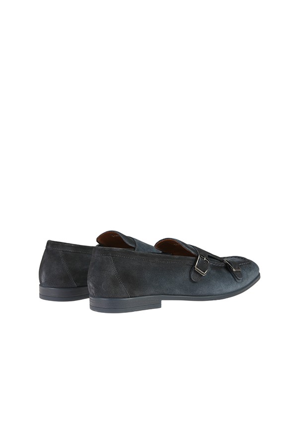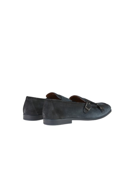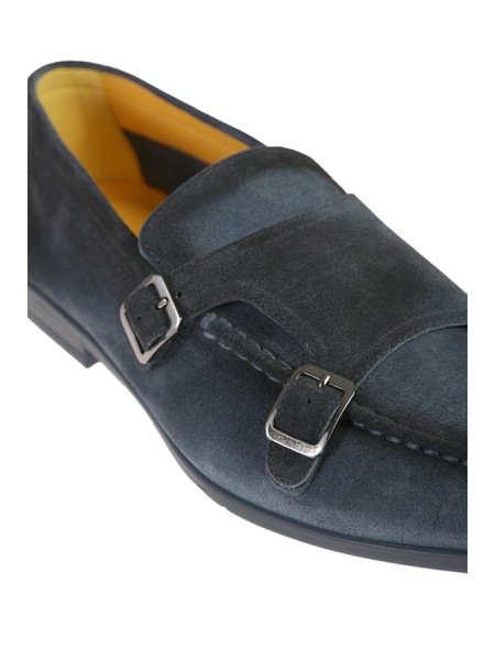 Modello mocassino con doppia fibbia, in pelle scamosciata. Fondo gomma.