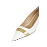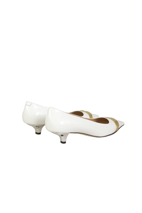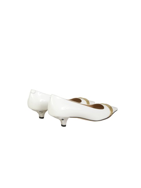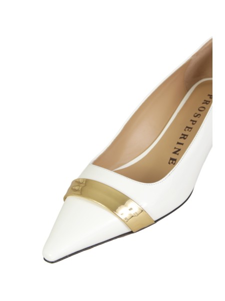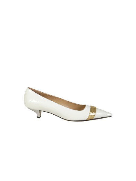 In vernice, con dettaglio oro. Interno in pelle. Suola in cuoio.