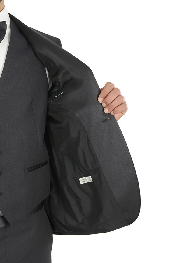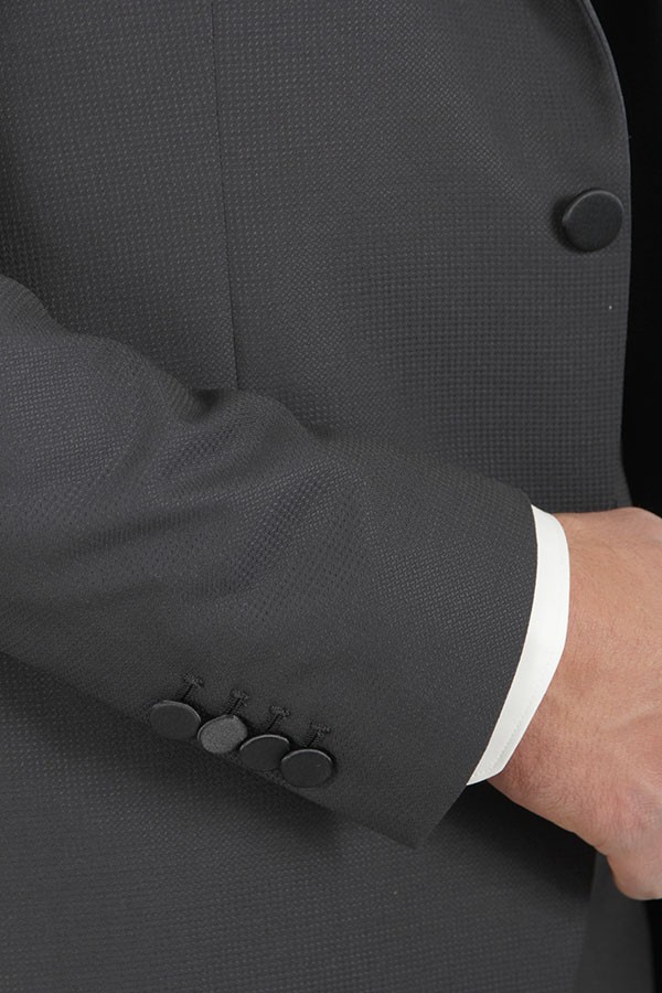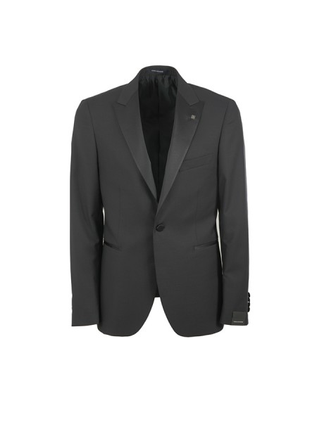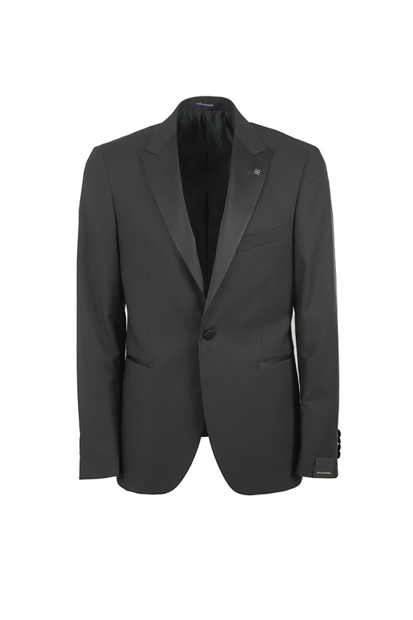 Giacca monopetto con revers e bottoni in tessuto lucido. Taschino sul petto.