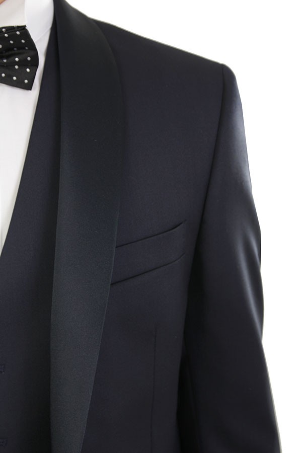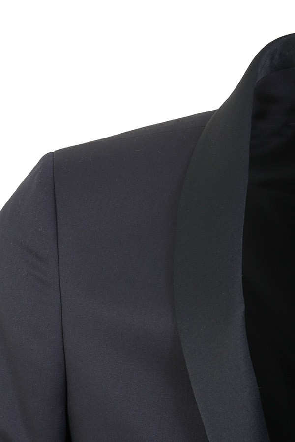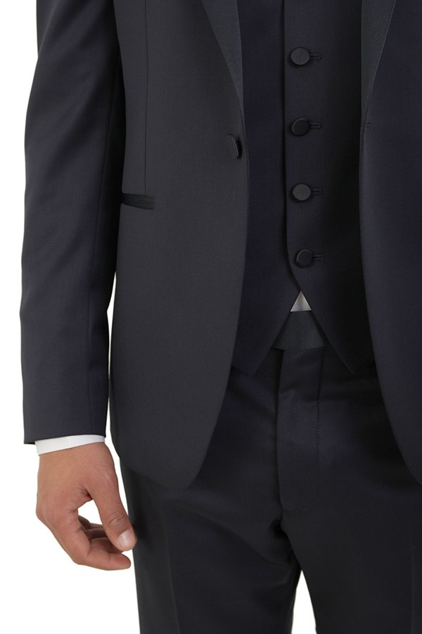 Giacca monopetto con revers e bottoni in tessuto lucido. Taschino sul petto.