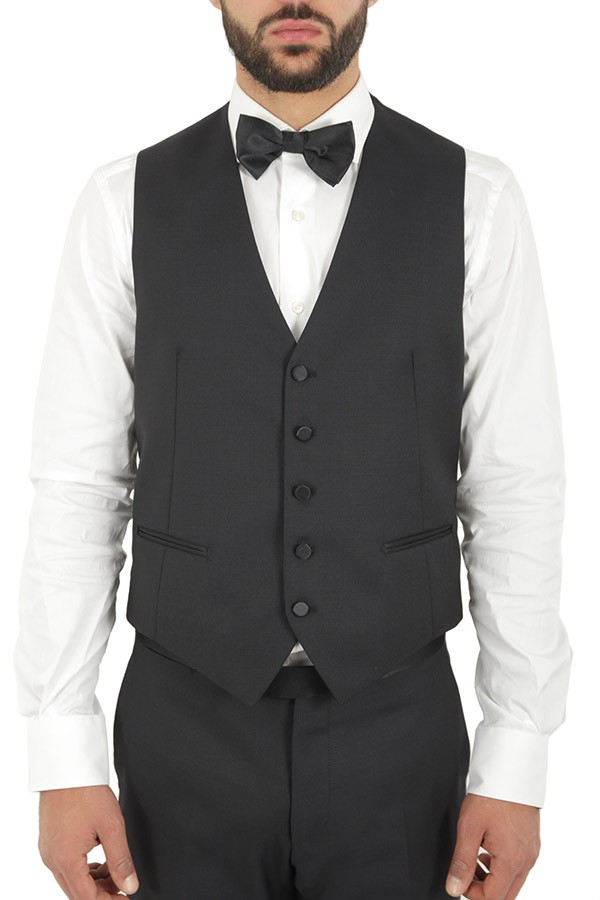 Bottoni rivestiti. Gilet e pantaloni con dettagli lucidi.