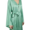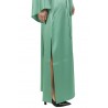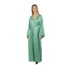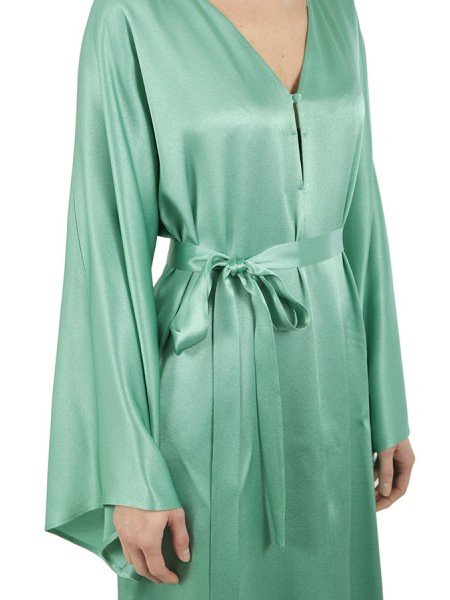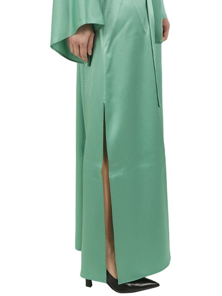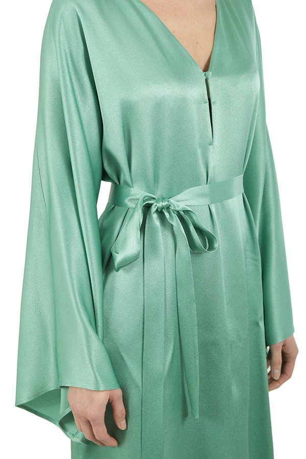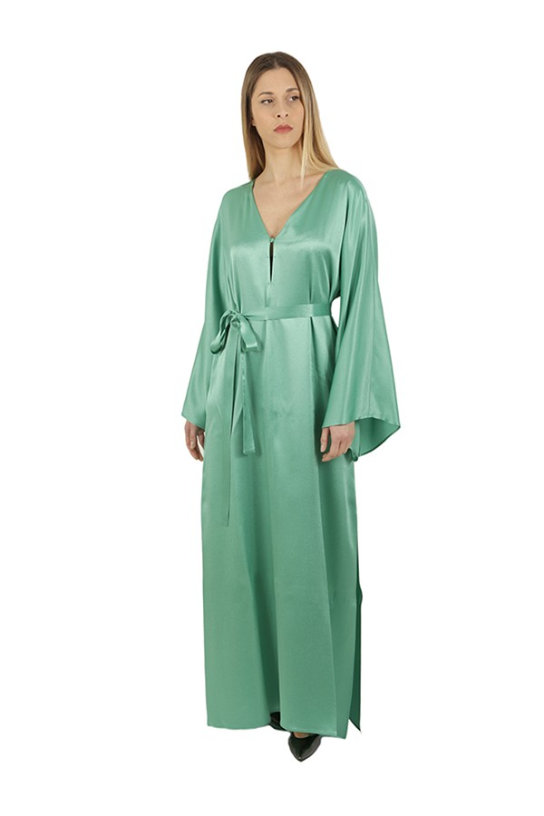 Lungo con spacco laterale, scollo a punta con bottoncino e maniche lunghe ampie. Fusciacca in vita.