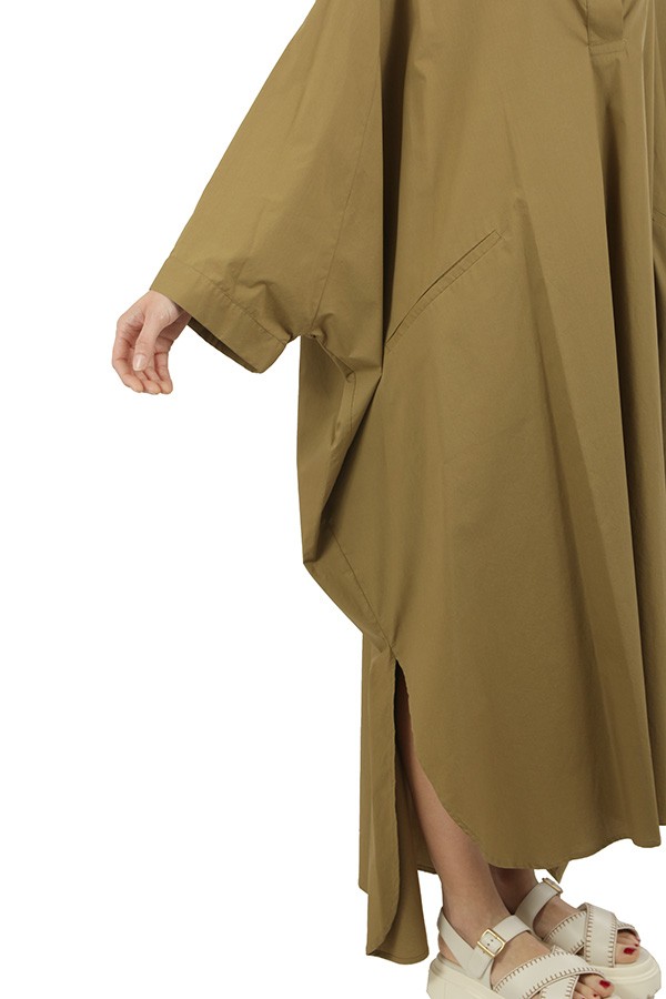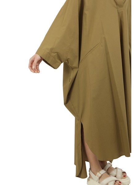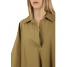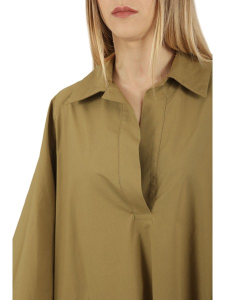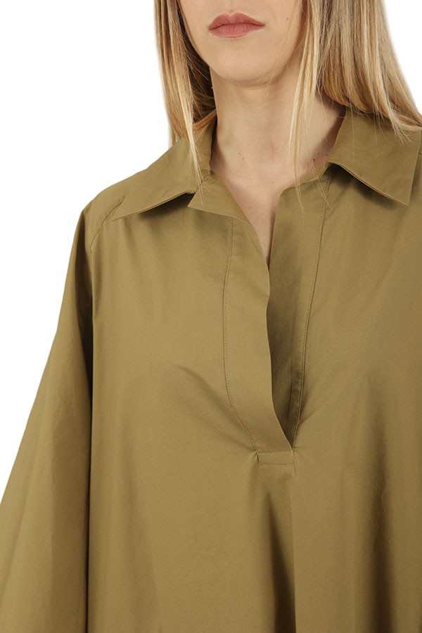 Realizzato in popeline, dalla vestibilità over. Con collo polo, fondo stondato e spacchi laterali. Maniche raglan. Fondo asimmetrico.