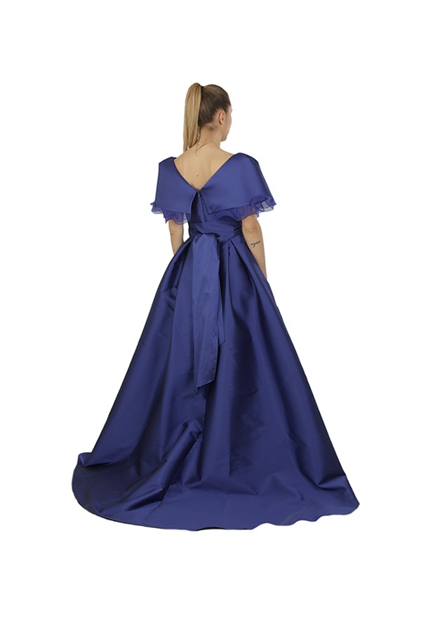 Dallo stile principesco, realizzato in misto seta. Con coda e maniche a mantellina, spacco laterale.